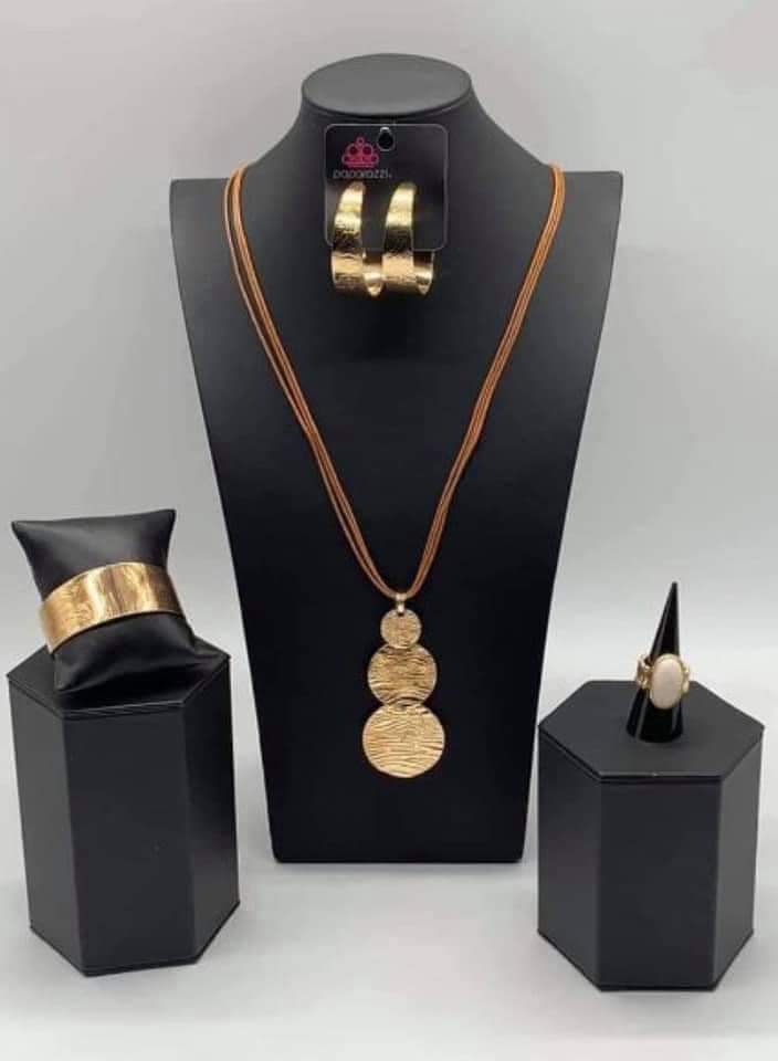 NECKLACE - "Circulating Shimmer (P2RE-GDXX-382EM)- Three shimmery gold discs featuring a wavy pattern flowing across the front, link together in graduating sizes at the end of a lengthened brown cord for an alluring appeal. Features an adjustable clasp closure.