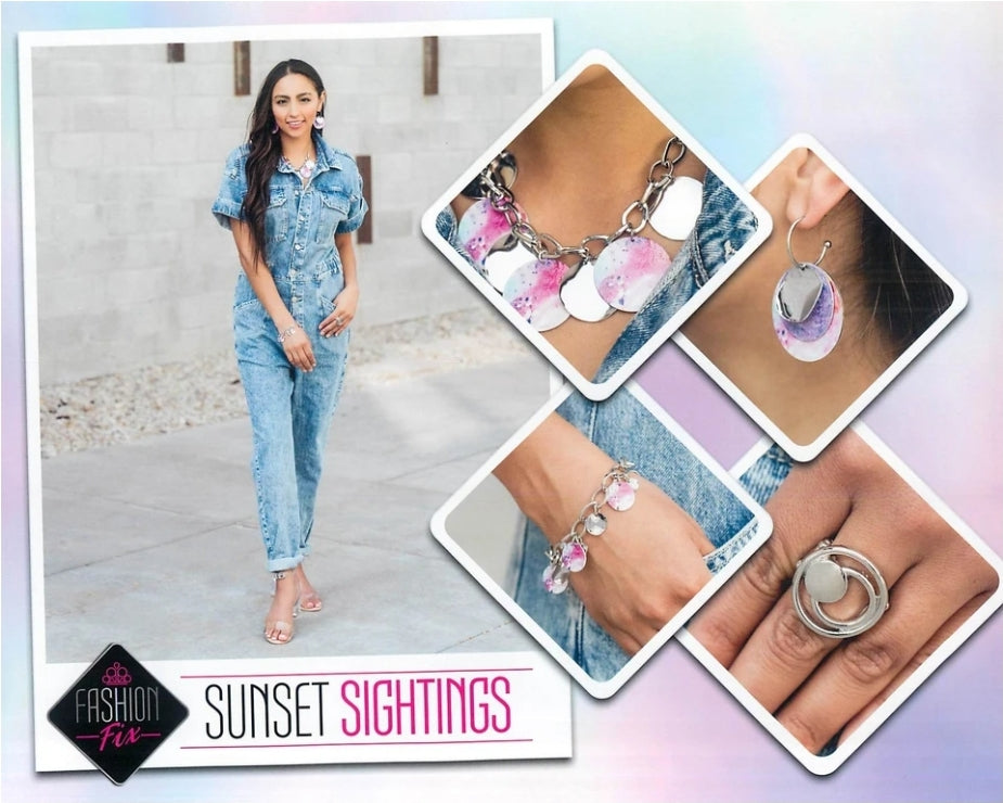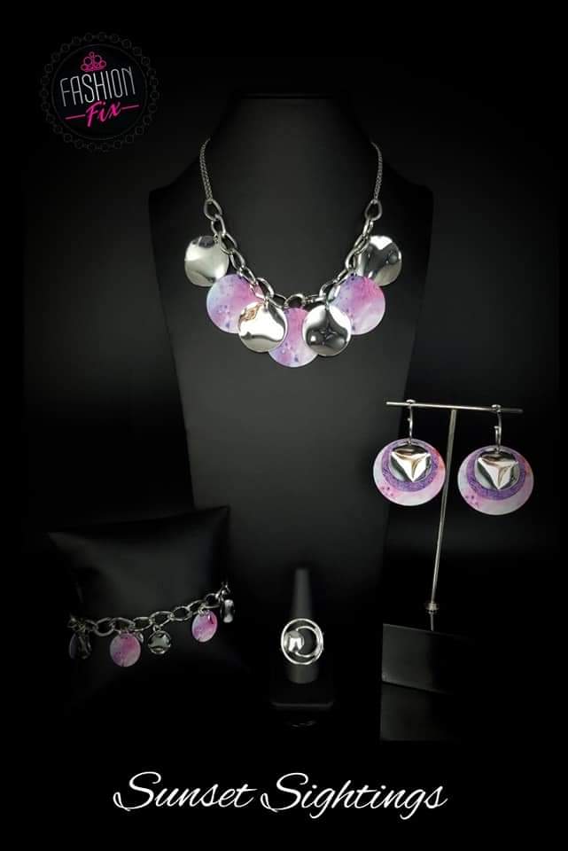 Necklace: " Tie Dye Drama" (P2ST-MTXX-063WO)- Featuring a galactic tie dye print, flat colorful discs swirled in tones of blue and purple combine with curved silver discs, swinging from the bottom of a bulky silver chain for a trendy throwback look. Features an adjustable clasp closure.