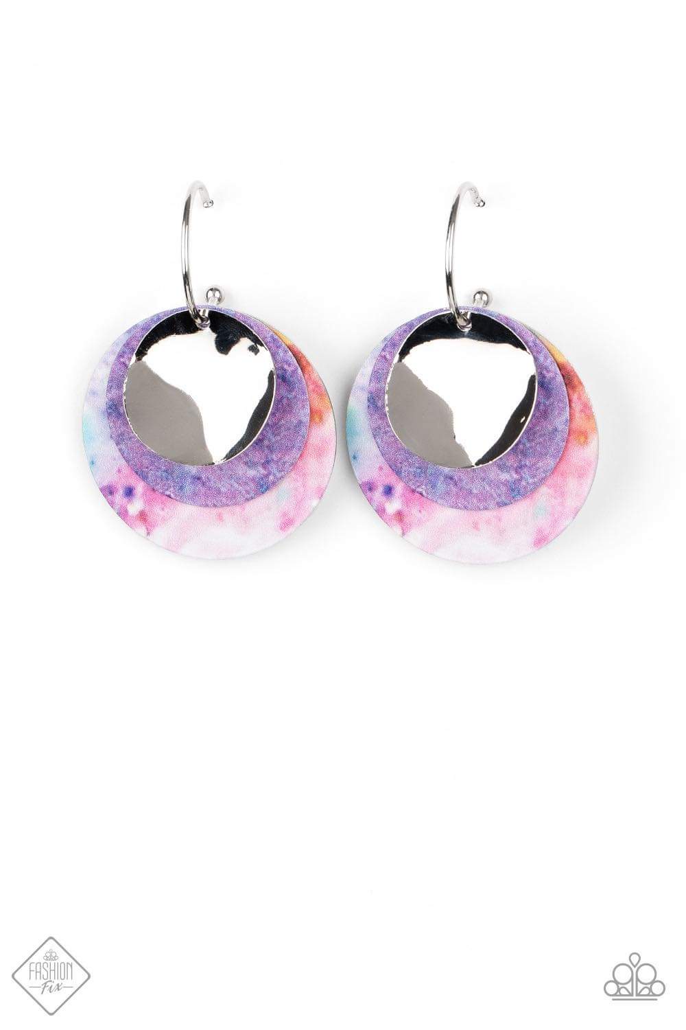 Earring: "Ride or TIE DYE" (P5HO-MTXX-003WO)- Featuring a retro tie dye print, two flat colorful discs and a curved silver disc stack along a dainty silver hoop with a barbell cap to create a trendy throwback look. Earring attaches to a standard post fitting. Hoop measures approximately 1” in diameter.
