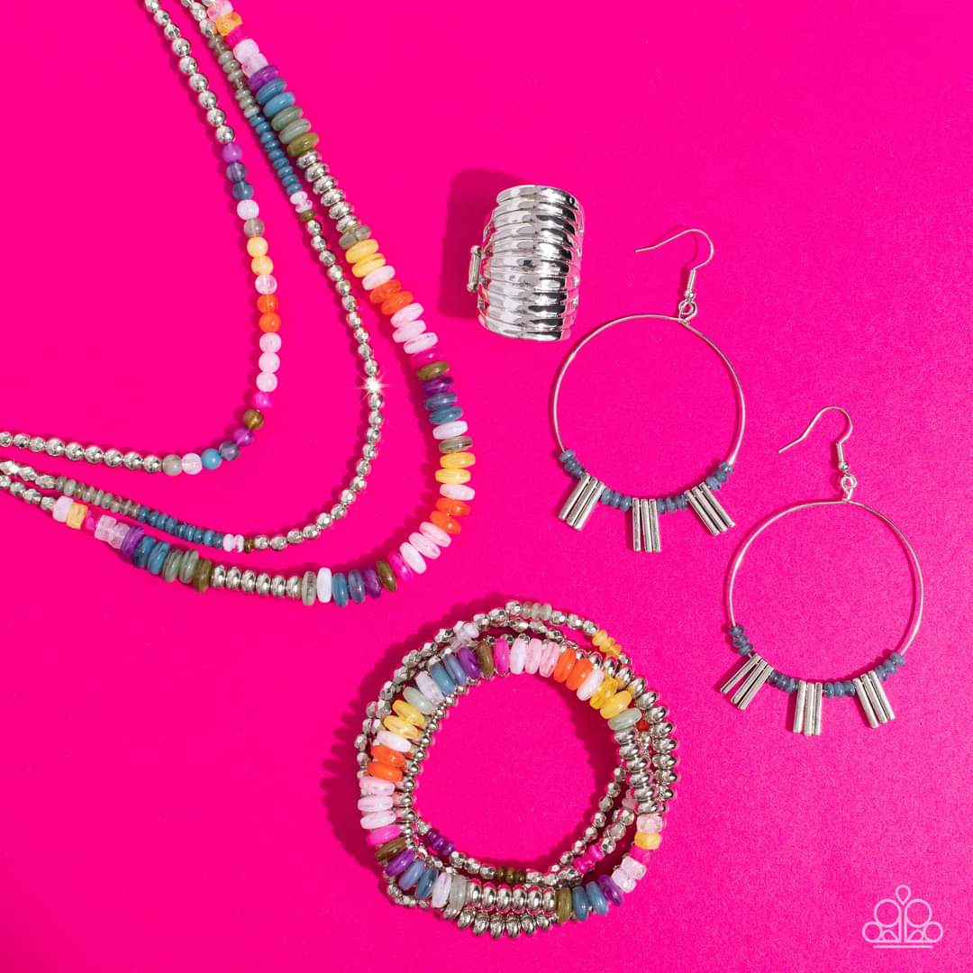 NECKLACE: Newly Neverland - Multi - P2SE-MTXX-248KF -- Defaced silver beads combine with a collection of solid, milky, and cloudy beads in varying sizes and colors, to create a playful trio of silver layers down the chest. Featured in colors of Waterspout, Loden Frost, white, purple, fuchsia, baby pink, Orange Tiger, Samoan Sun, Midnight, and Martini Olive, the beads create a youthful and energetic impression that will never grow up, as the colorful layers connect to an elongated silver chain. Features an adjustable clasp closure.