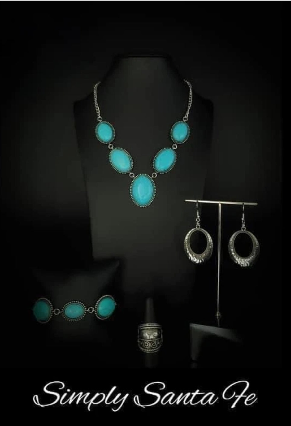 Necklace: "River Valley Radiance" - Bordered in rustic silver studded frames, an earthy collection of oversized turquoise stones boldly links below the collar, creating a timeless Southwestern staple. Features an adjustable clasp closure.