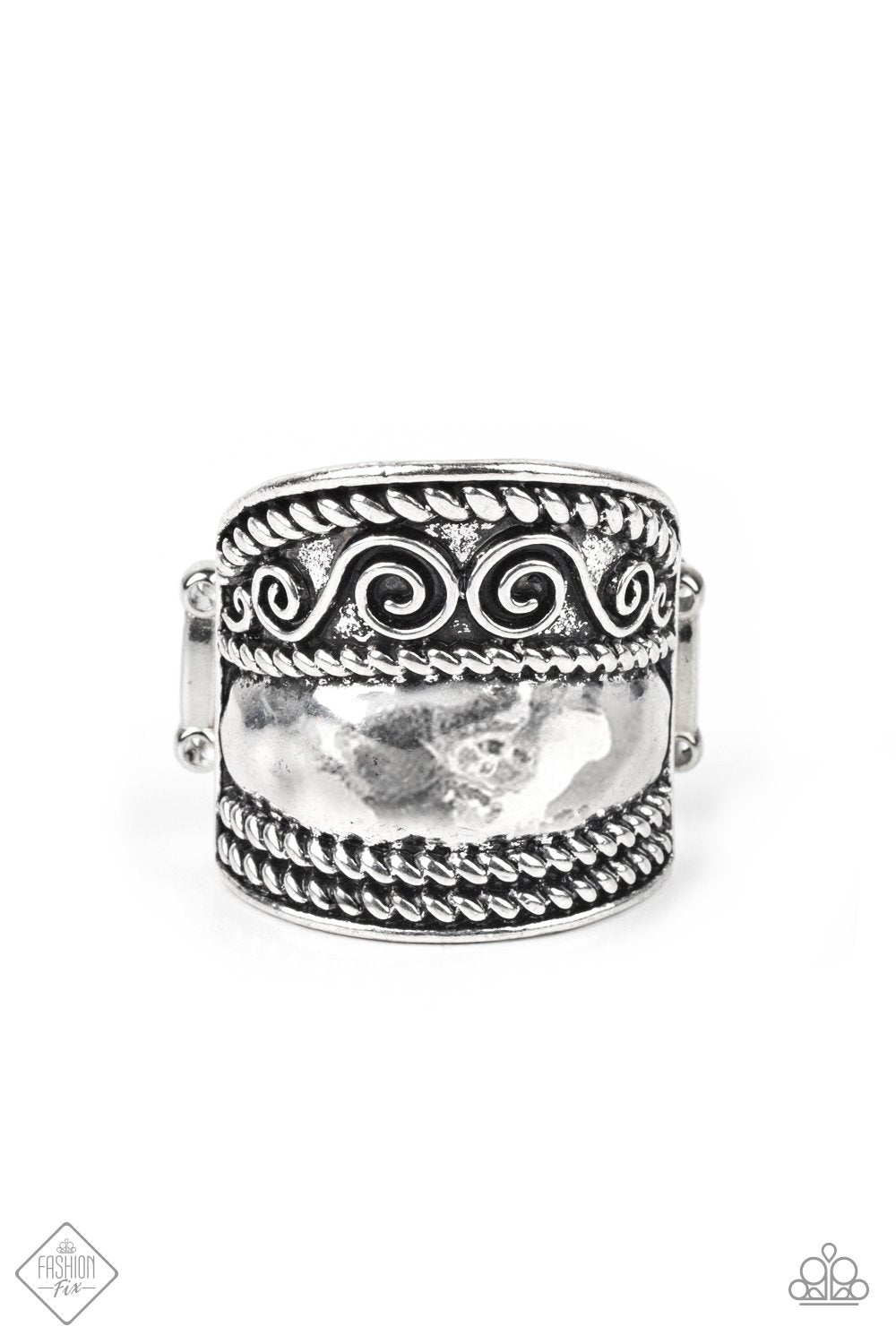 Ring: "Texture Tantrum" - Brushed in an antiqued shimmer, rope-like textures and a swirling silver pattern border a beveled band, creating a collision of texture across the finger. Features a stretchy band for a flexible fit.