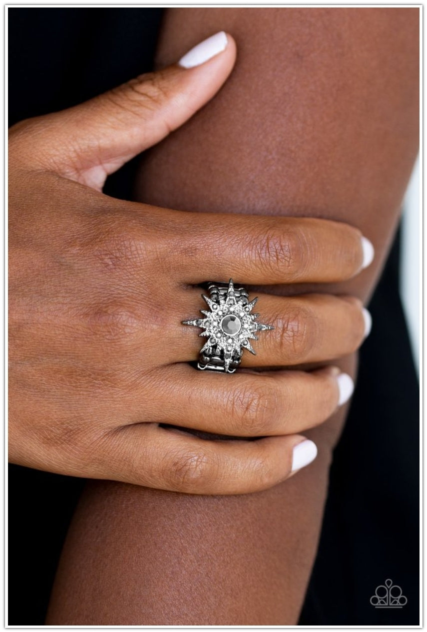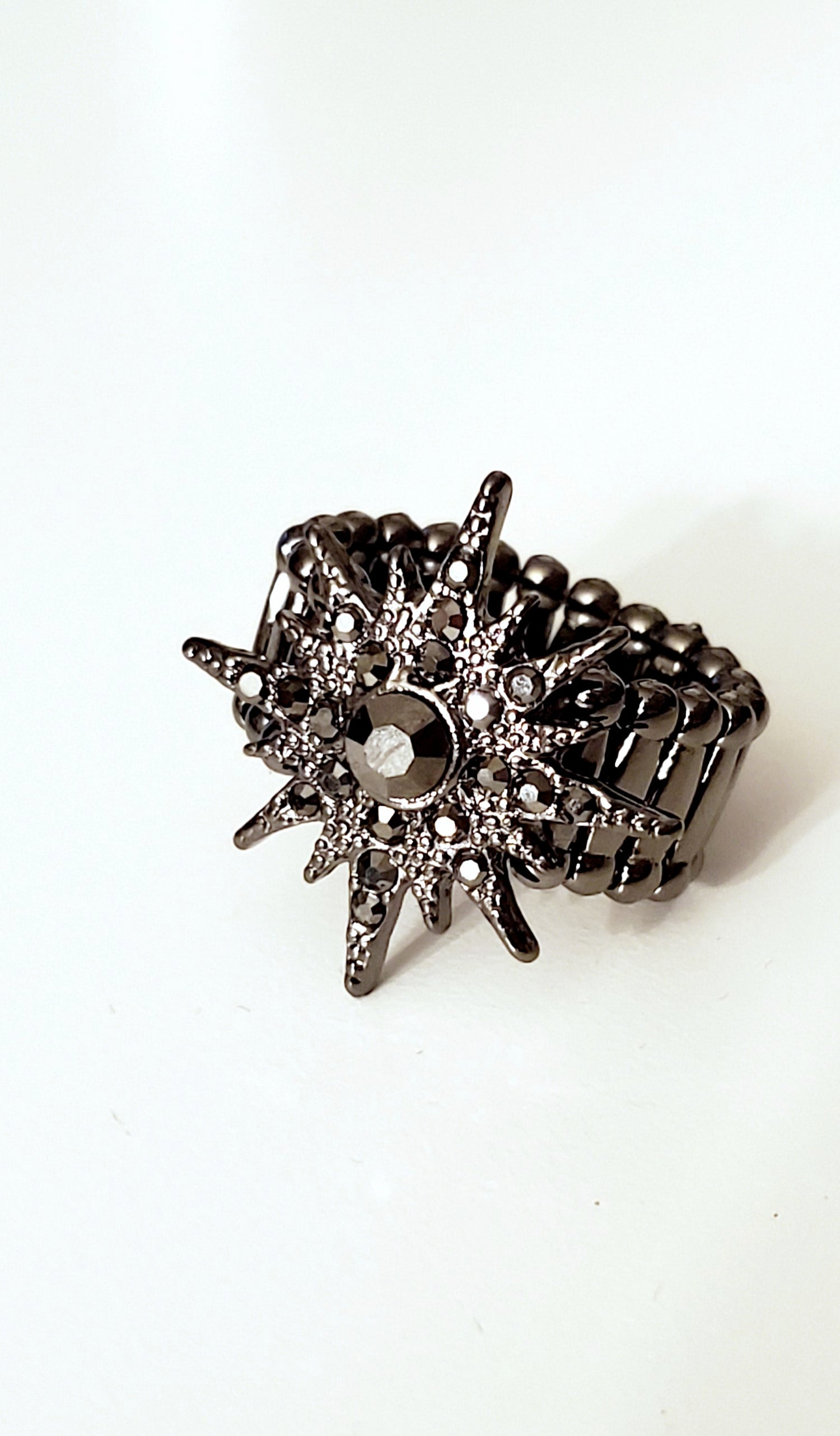 Radiating with smoky hematite rhinestones, a gunmetal star-like frame bursts across the finger for a stellar look. Features a stretchy band for a flexible fit.