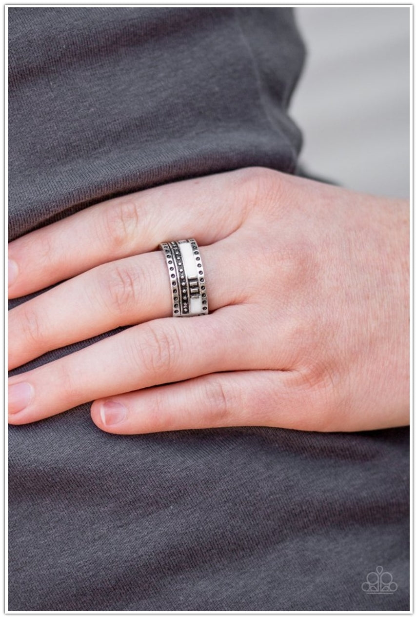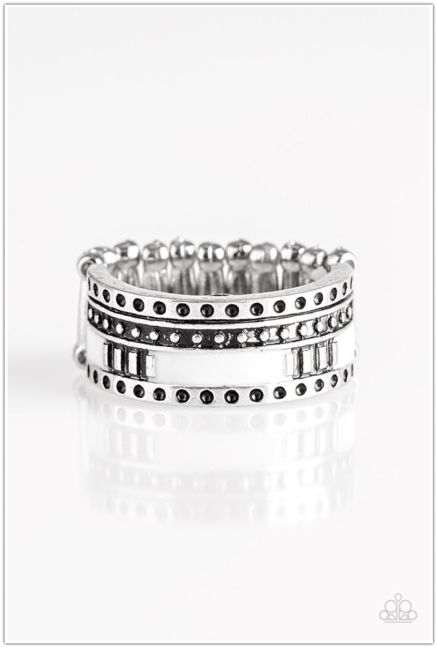 Brushed in shiny white accents, a textured silver frame arcs across the finger for a seasonal look. Features a stretchy band for a flexible fit.