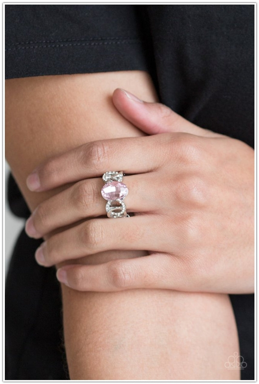 White rhinestone encrusted frames and shiny silver frames link across the finger, coalescing into an airy band. A glittery pink rhinestone is pressed into the center of the band for a glamorous finish. Features a stretchy band for a flexible fit.