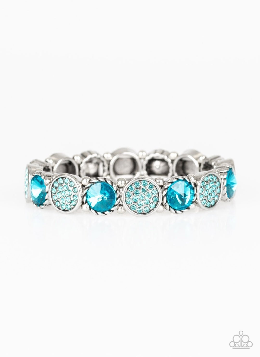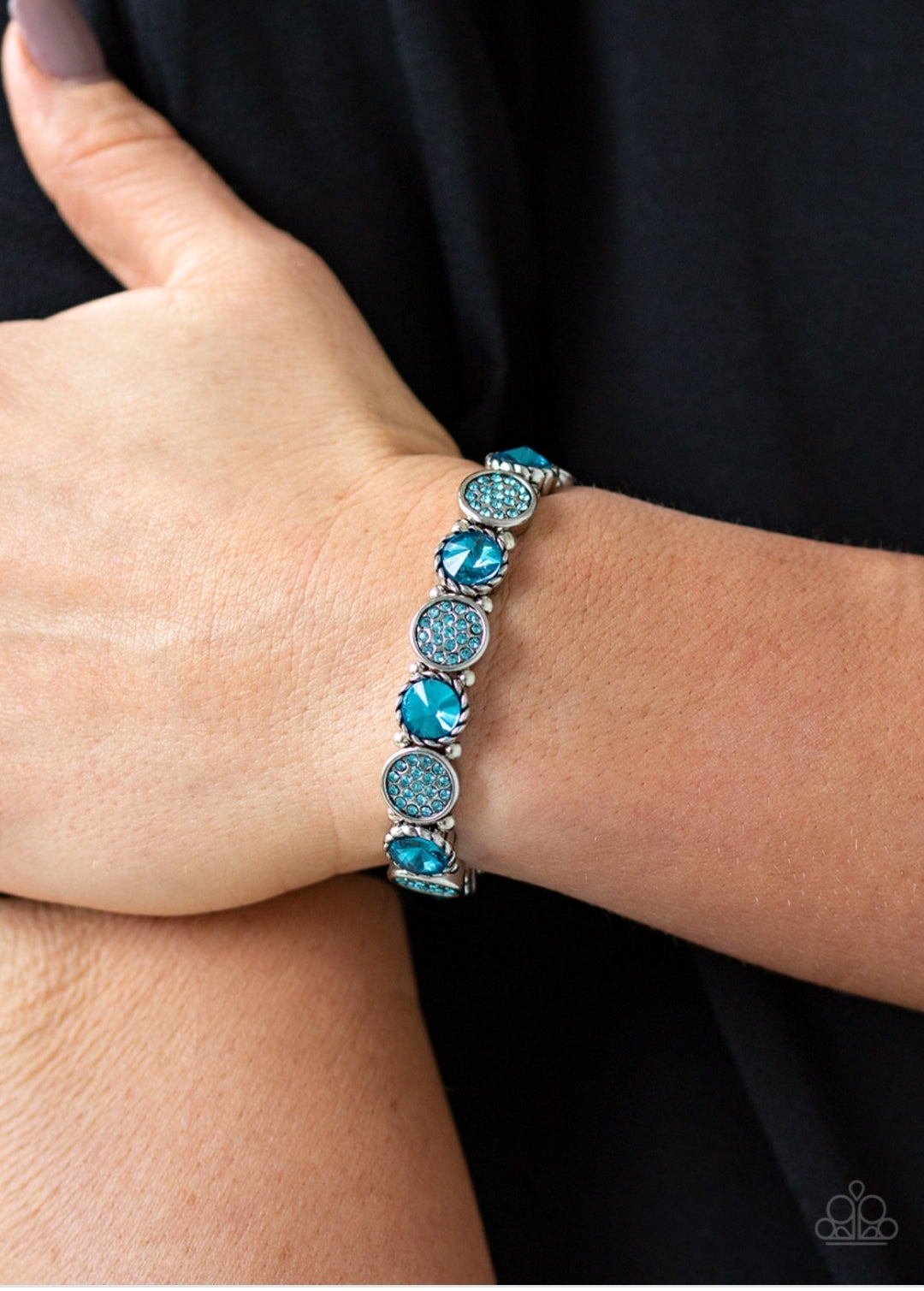 Featuring an array of glittery blue rhinestones, mismatched silver frames and dainty silver beads are threaded along stretchy bands around the wrist for a glamorous flair.