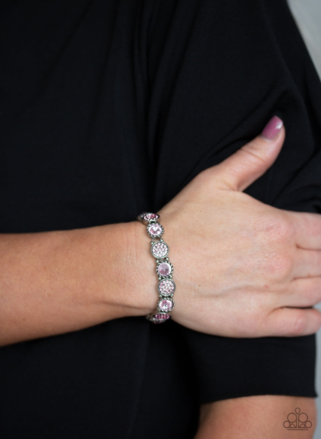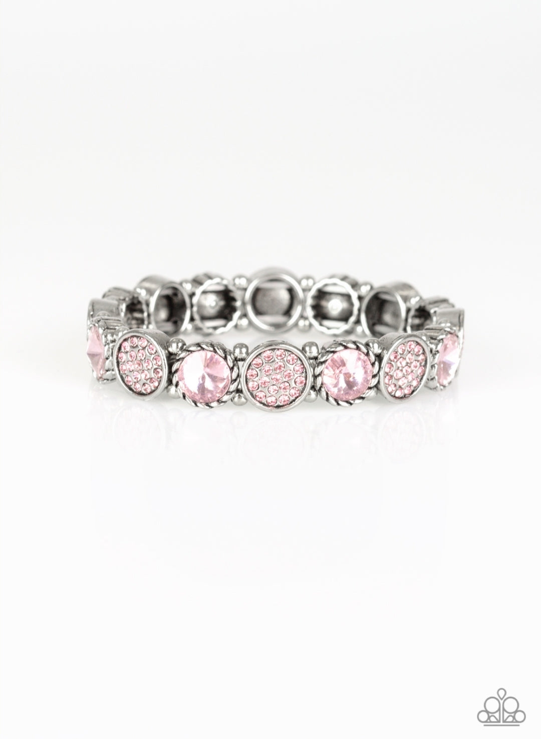 Featuring an array of glittery pink rhinestones, mismatched silver frames and dainty silver beads are threaded along stretchy bands around the wrist for a glamorous flair.