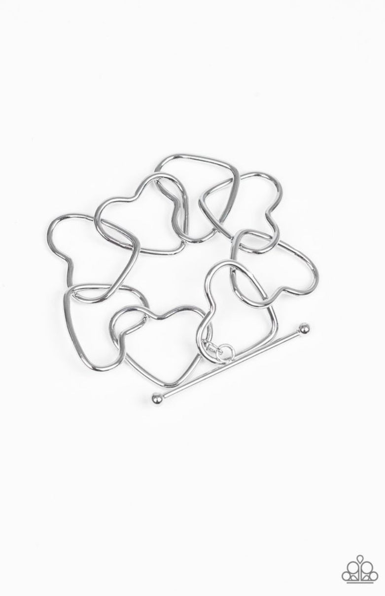 Airy silver heart silhouettes connect around the wrist for a flirtatious look. Features a toggle closure.