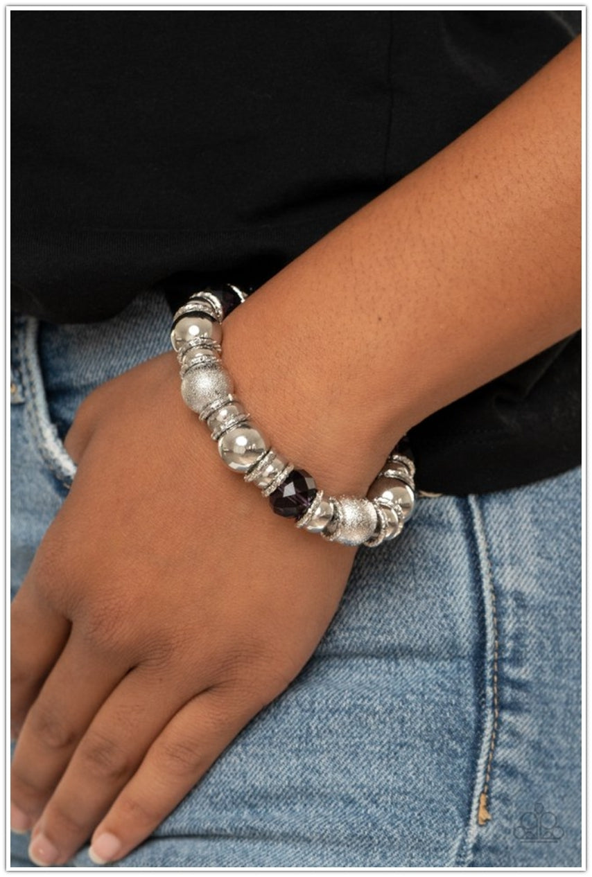 A glittery compilation of mismatched silver beads, silver rings, and sparkly purple crystal-like beads are threaded along a stretchy band around the wrist for a glamorous glow.
