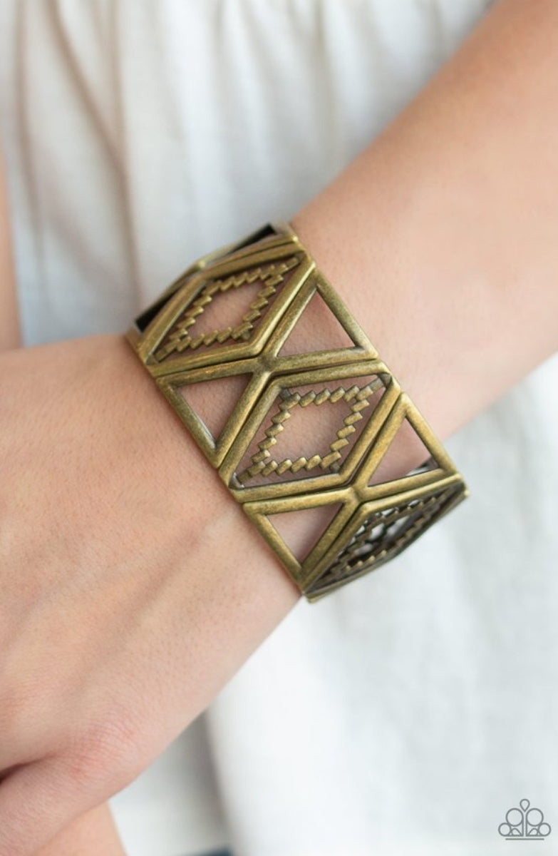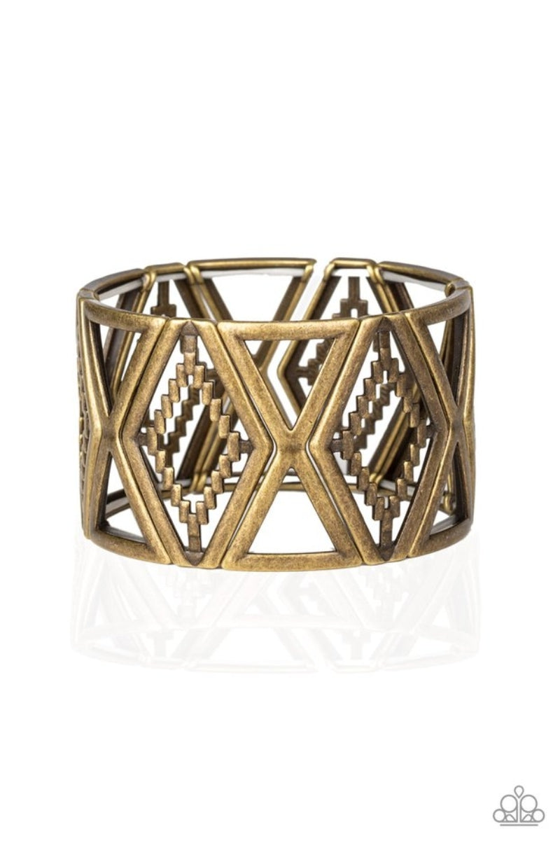 Featuring metallic textile patterns, a collection of abstract brass frames are threaded along stretchy bands around the wrist for a bold tribal inspired look.