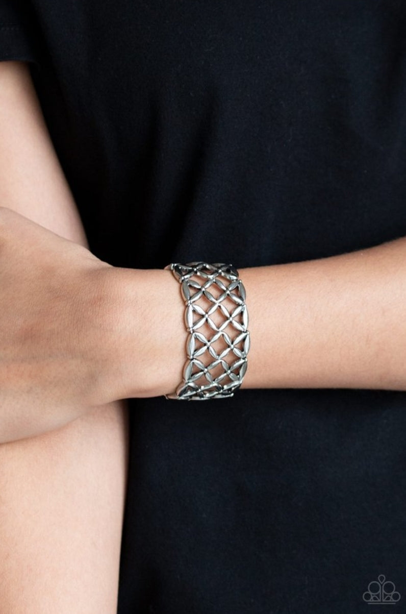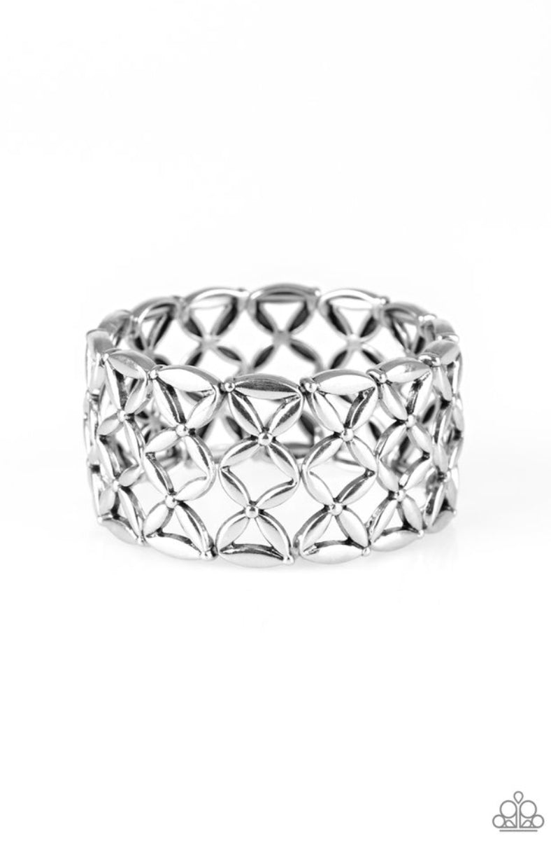 Shimmery silver floral frames are threaded along a stretchy band, stacking into a bold seasonal look.
