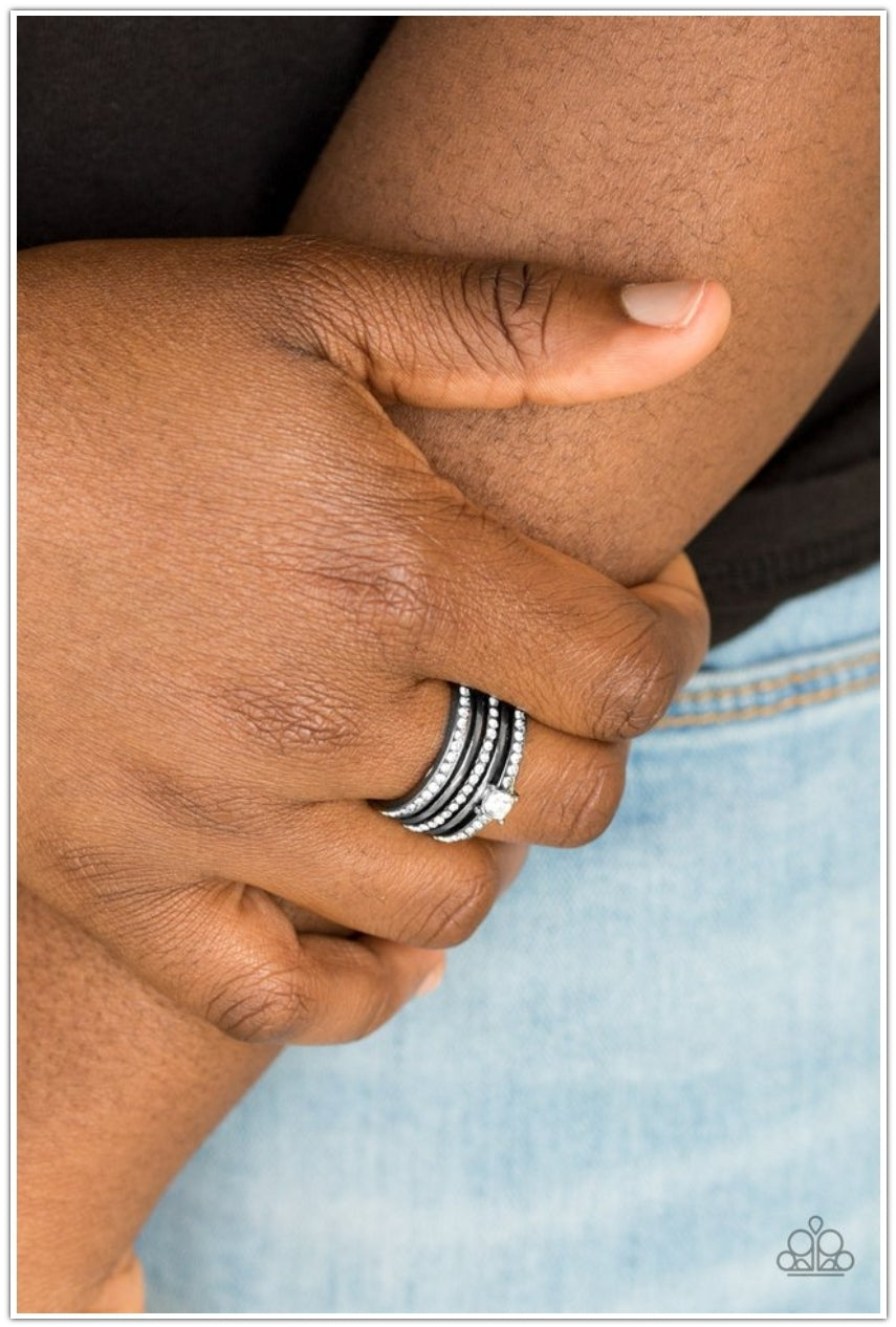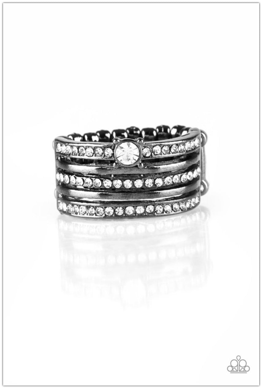 Encrusted in glassy white rhinestones, glittery bands alternate with shiny gunmetal bands across the finger. A slightly larger rhinestone adorns the uppermost band for a refined finish. Features a stretchy band for a flexible fit.