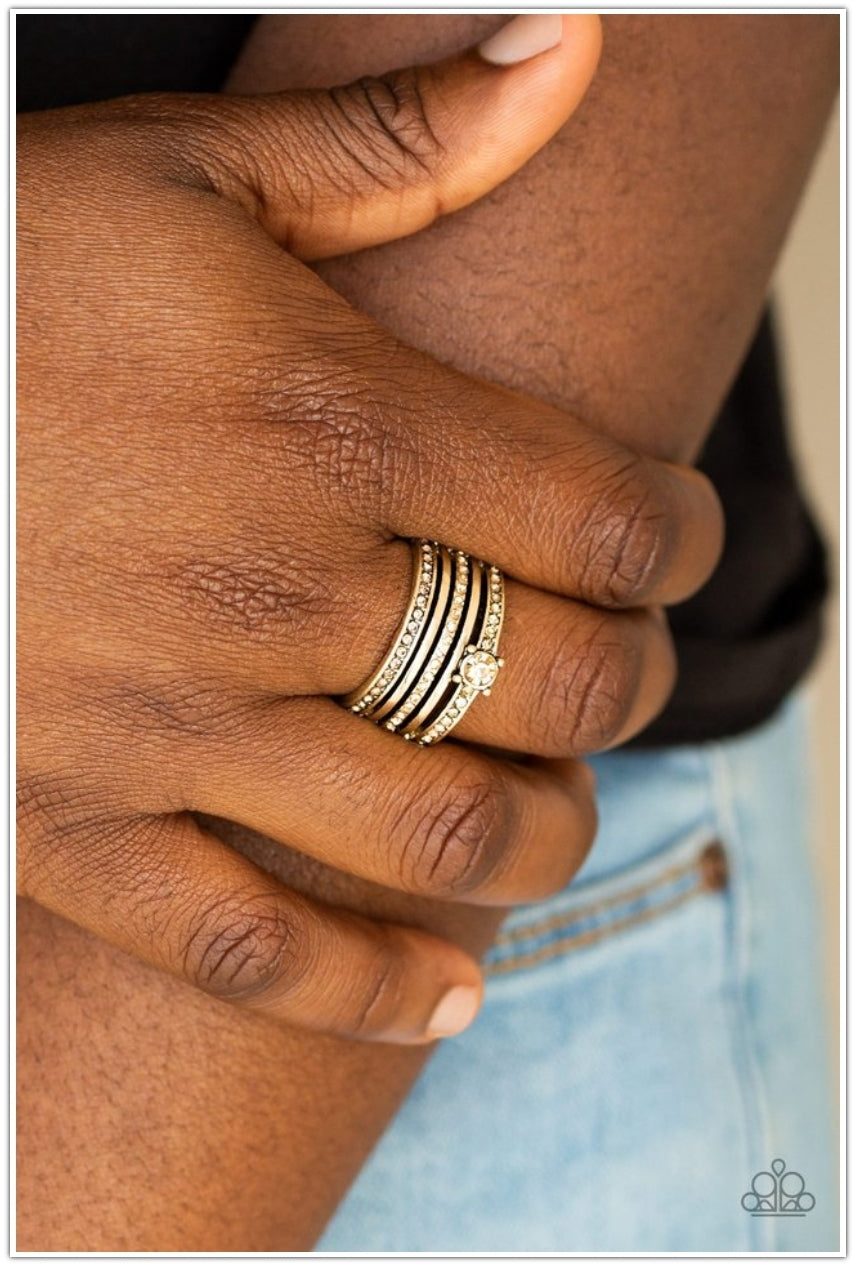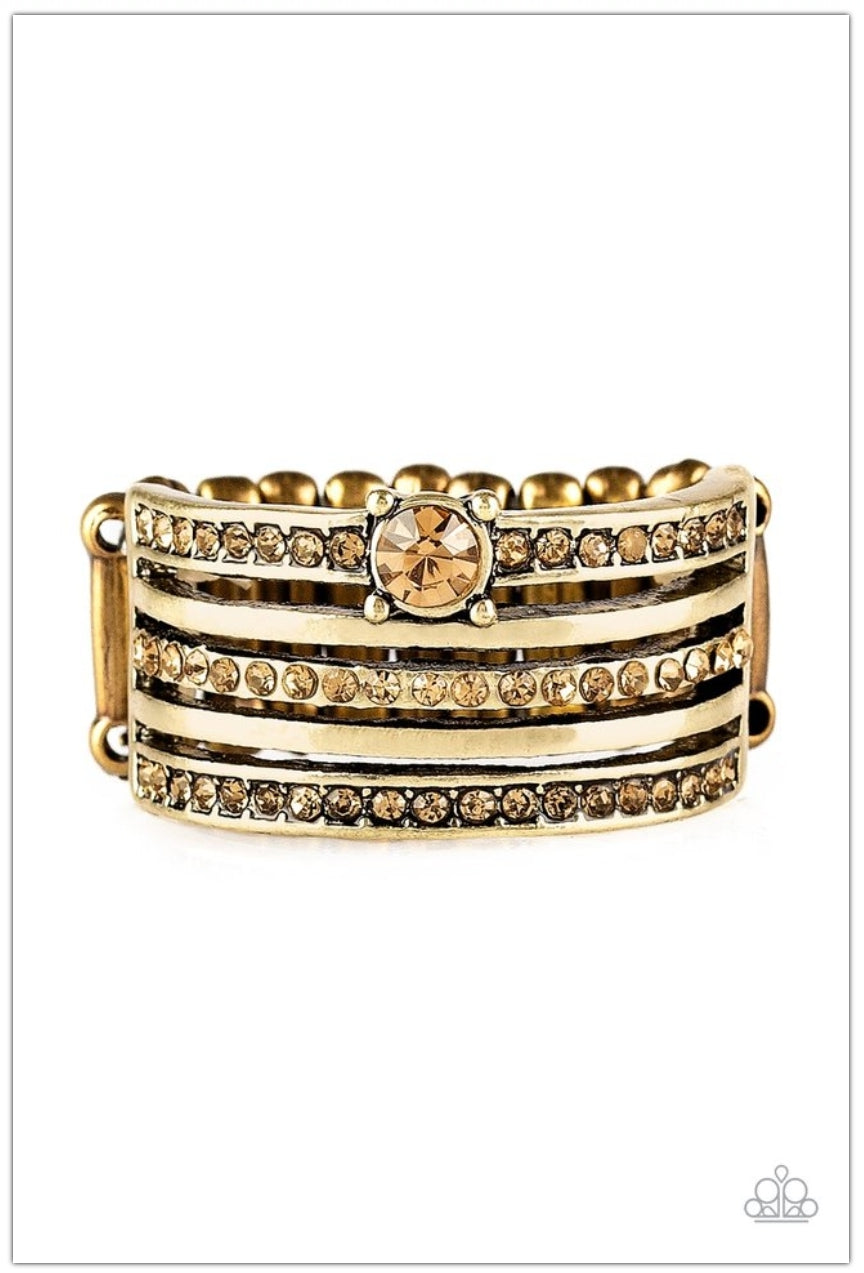 Encrusted in golden topaz rhinestones, glittery bands alternate with shiny brass bands across the finger. A slightly larger rhinestone adorns the uppermost band for a refined finish. Features a stretchy band for a flexible fit.