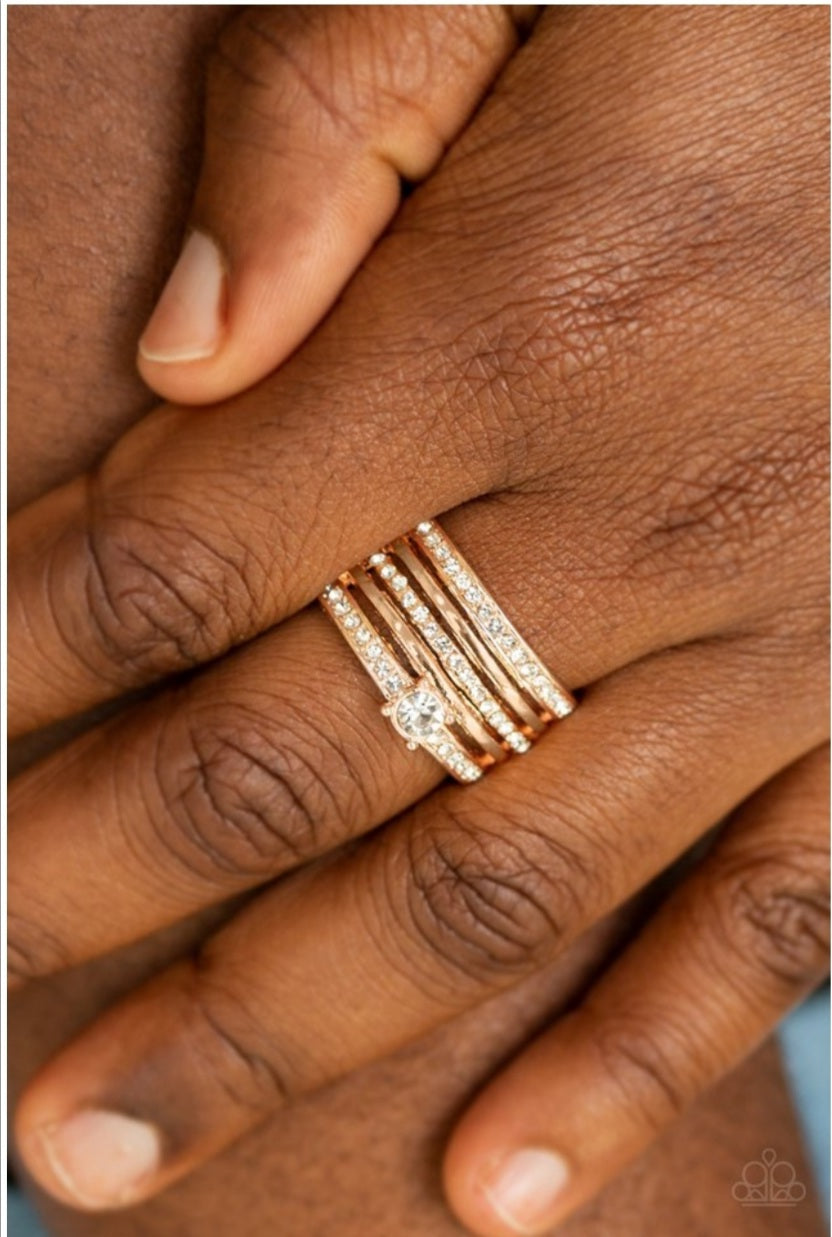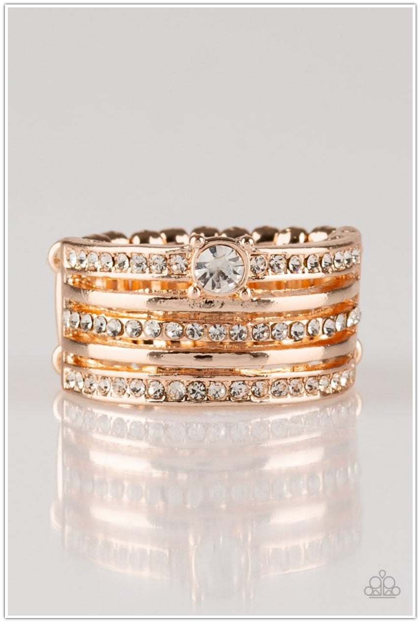 Encrusted in glassy white rhinestones, glittery bands alternate with shiny rose gold bands across the finger. A slightly larger rhinestone adorns the uppermost band for a refined finish. Features a stretchy band for a flexible fit.