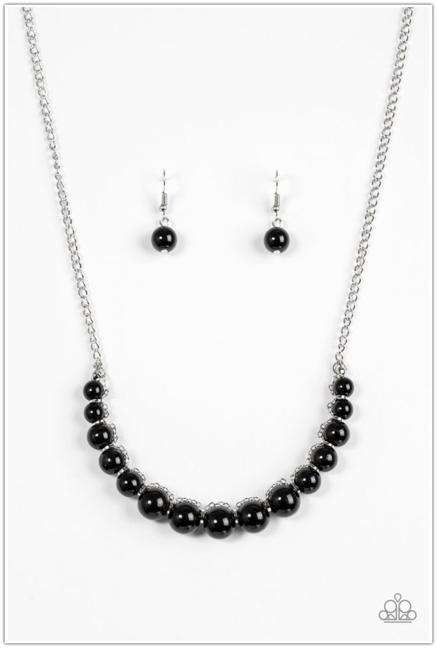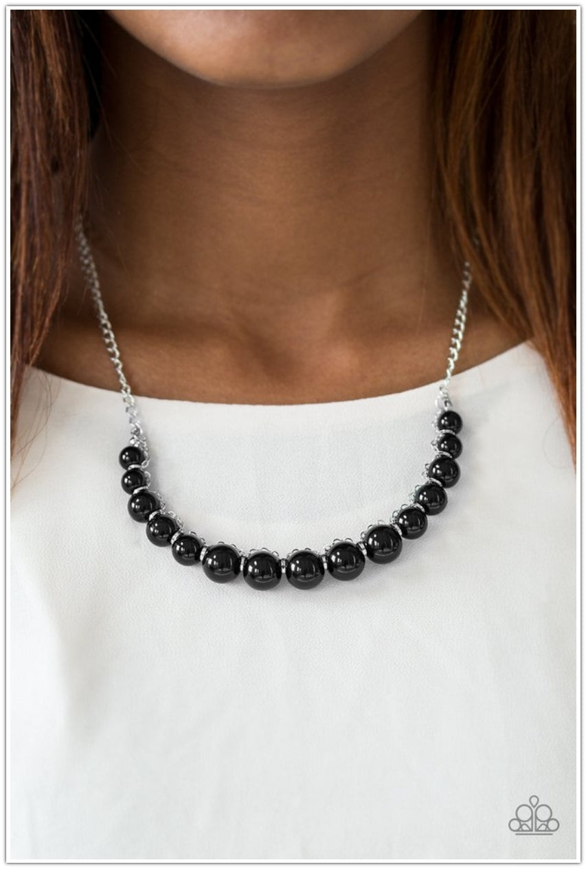 A classic strand of shiny black beads is threaded along an invisible string, creating a stationary pendant below the collar. Infused with shimmery silver accents, silver chain weaves atop the beads for a refined finish. Features an adjustable clasp closure.