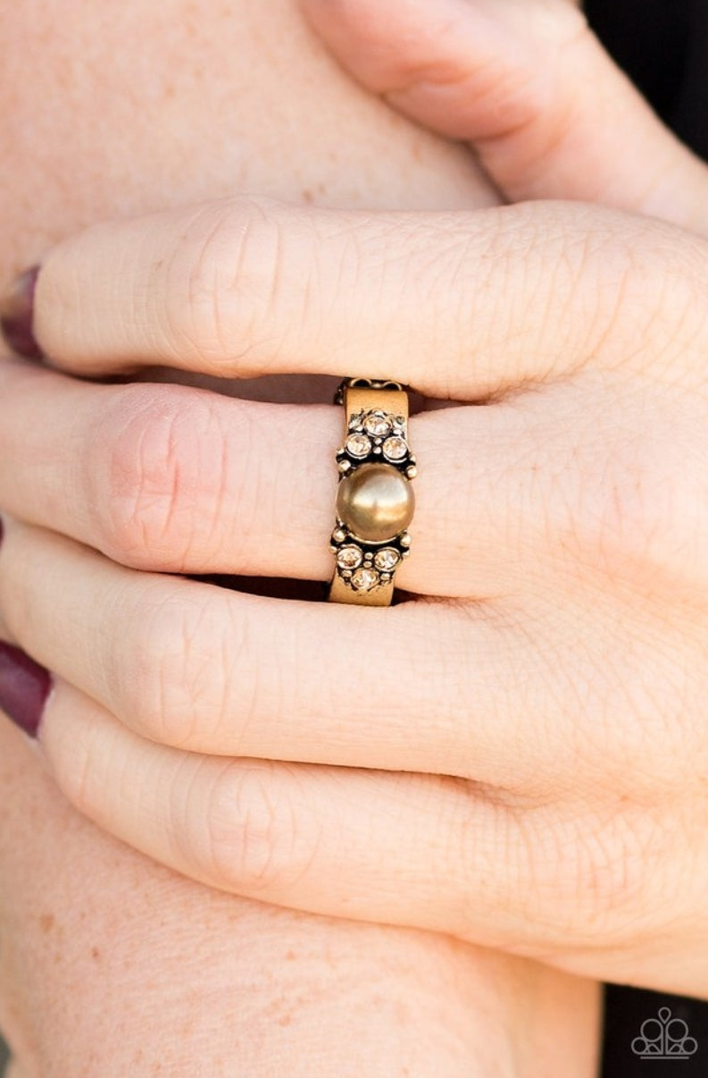 A brassy pearl is pressed into the center of a glistening brass band radiating with glittery topaz rhinestones for a timeless look. Features a dainty stretchy band for a flexible fit.