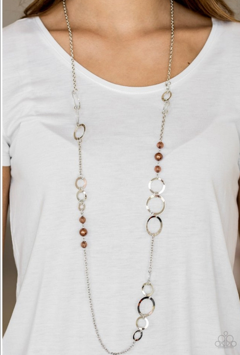 Shimmery silver hoops give way to sections of glassy and pearly brown beading for a refined look. Features an adjustable clasp closure.