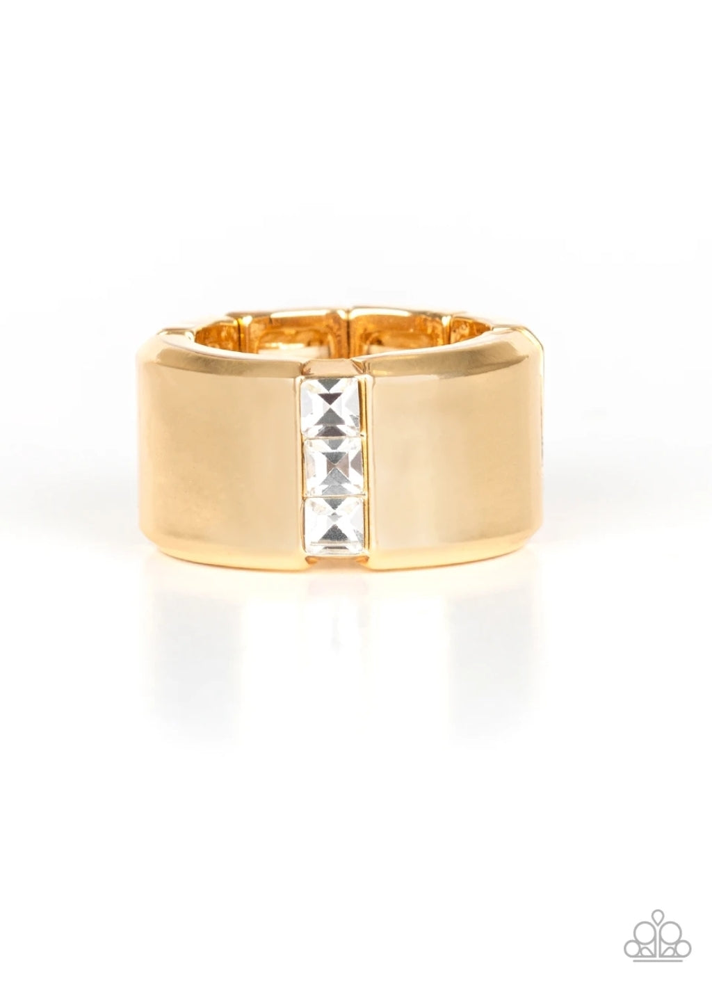 A single row of square-cut white rhinestones stack down the center of a thick gold band. Features a stretchy band for a flexible fit.