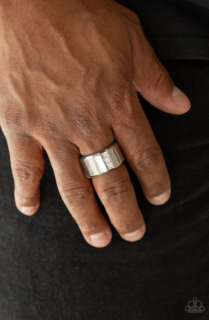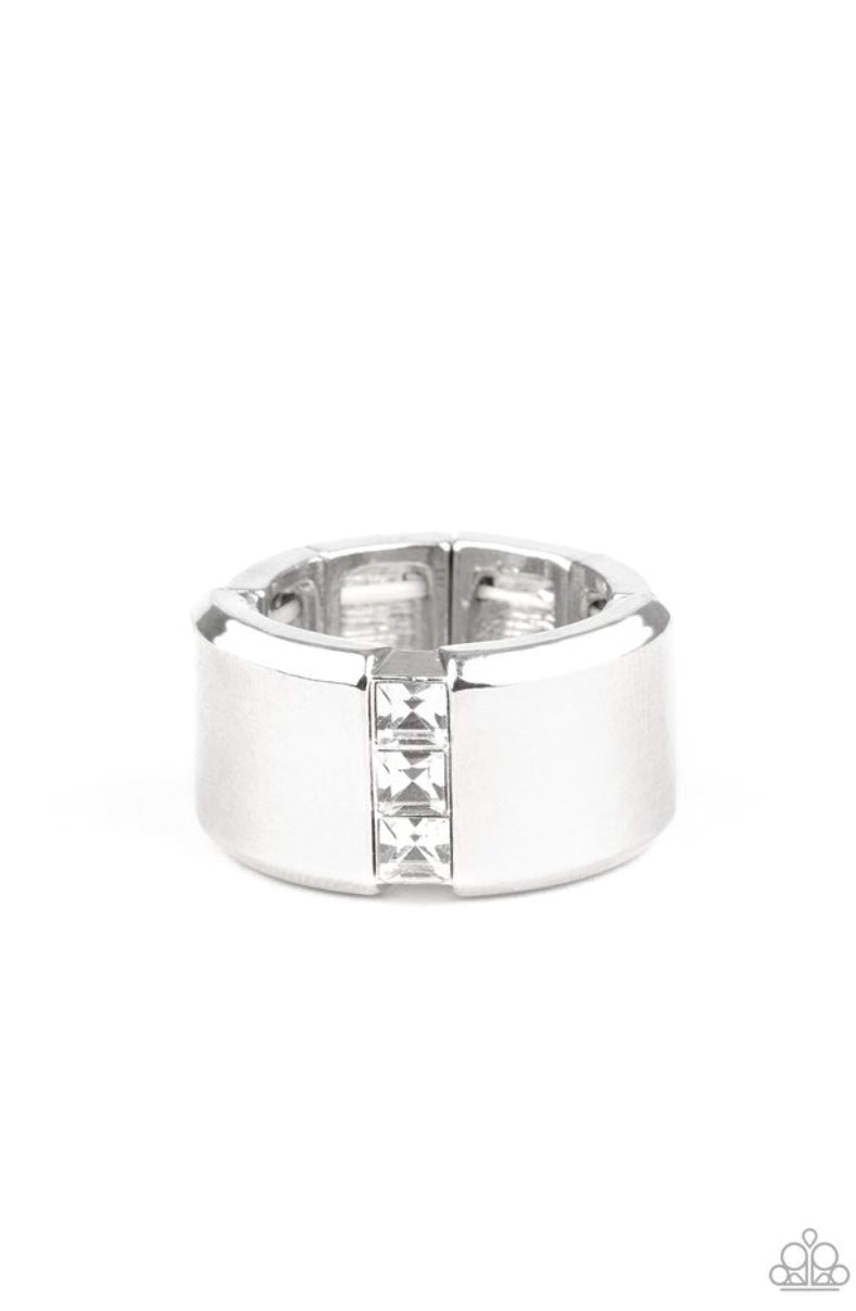 A single row of square-cut white rhinestones stack down the center of a thick silver band. Features a stretchy band for a flexible fit.