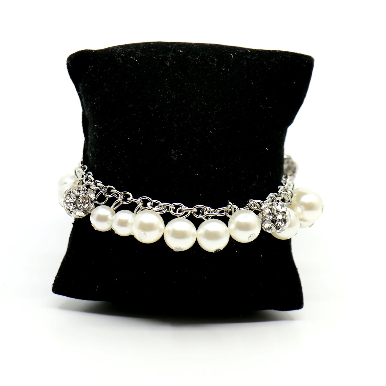 Bracelet with white beads and accent beads featuring white rhinestones. Features an adjustable clasp closure.
