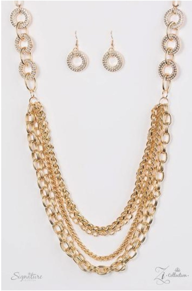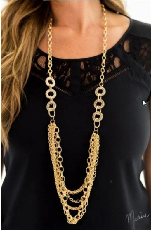 Encrusted in glittery white rhinestones, glistening gold frames give way to layers of shimmery gold chains. Varying in size and shimmer, the bold assortment of gold chains drape across the chest in a fierce and flawless fashion. Features an adjustable clasp closure.