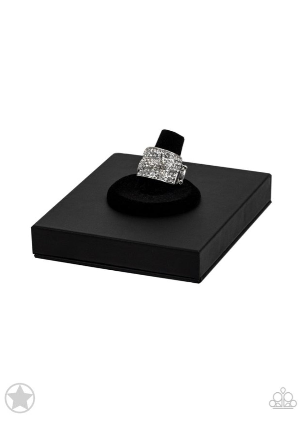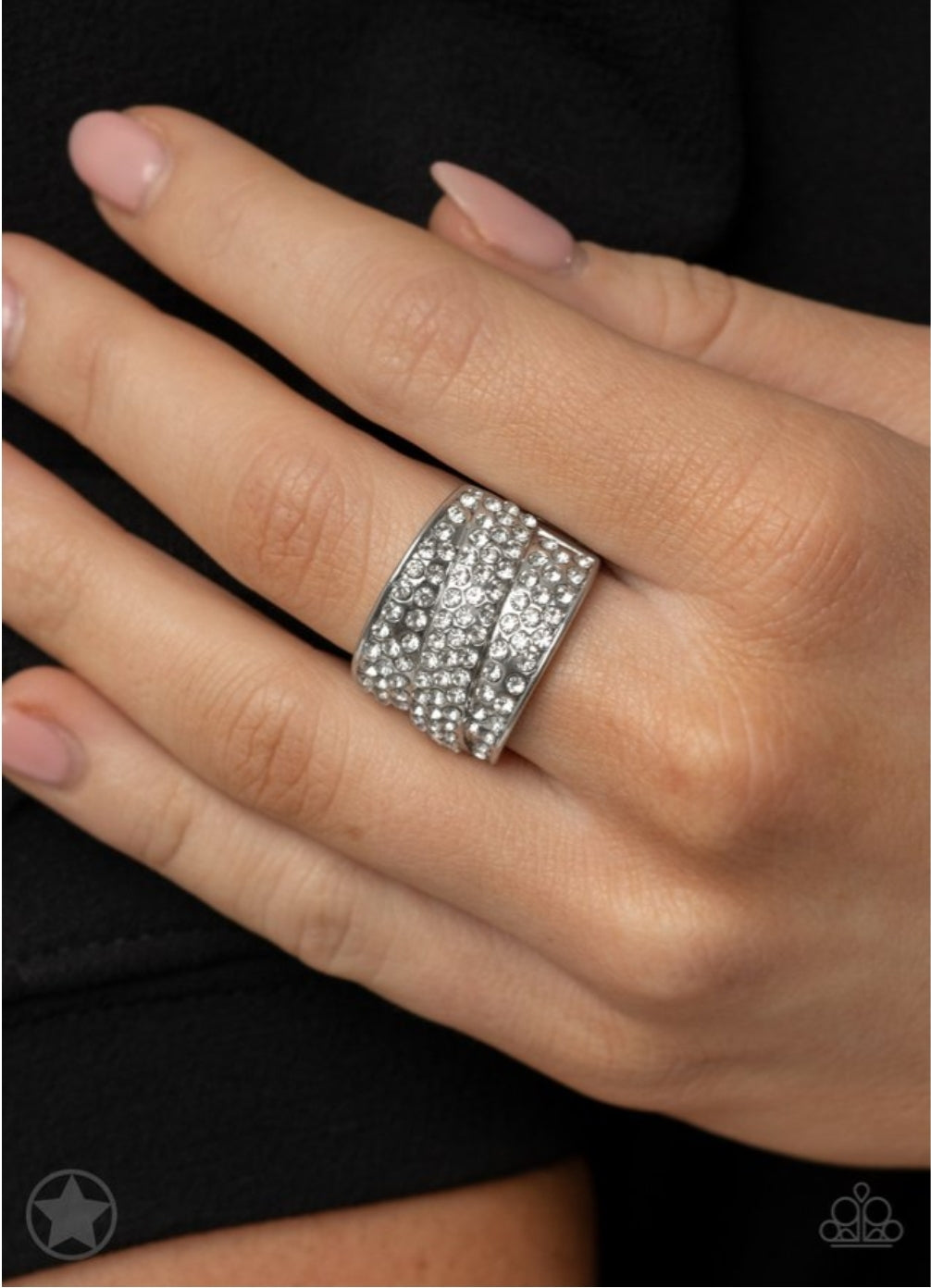 Row upon row of glistening white rhinestones stack into an incandescent display. An additional row of sparkling rhinestones wraps diagonally across the band for an extra splash of refined shimmer. Features a stretchy band for a flexible fit.