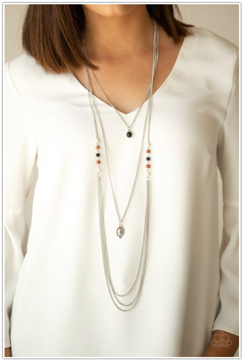 Multicolored stone beads give way to layers of shimmery silver chain down the chest. A black stone pendant and shiny silver frame drape above the cascade of silver chains for a seasonal flair. Features an adjustable clasp closure.