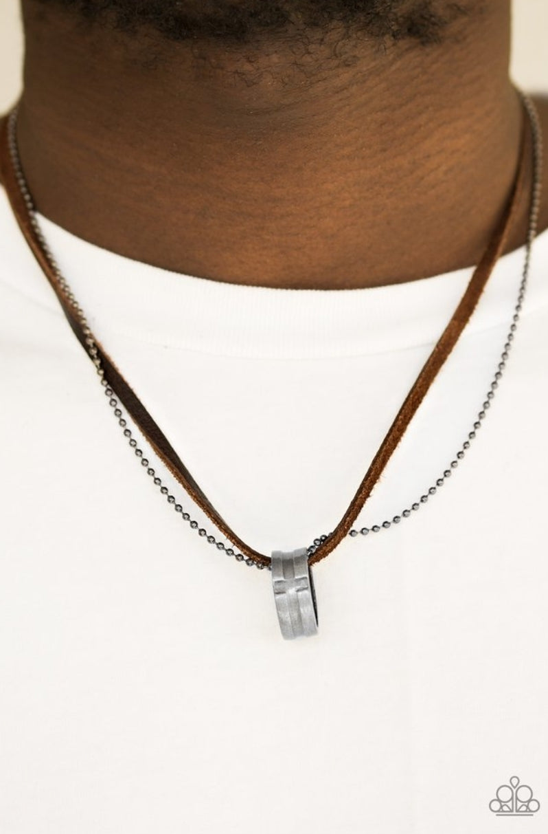 A bold silver ring slides along a strand of brown suede and a glistening gunmetal ball-chain, creating a rustic look below the collar. Features an adjustable sliding knot closure.