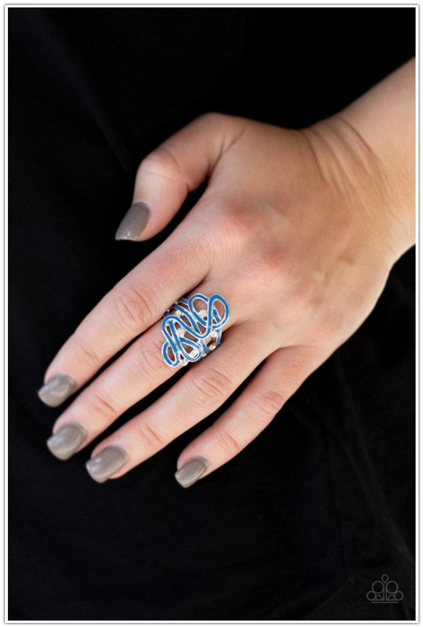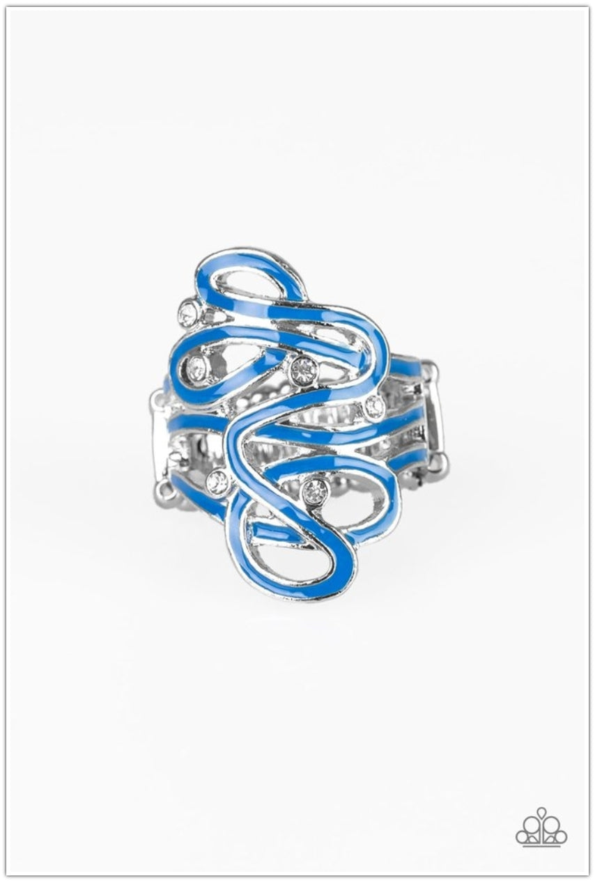 Painted in a shiny blue finish, glistening silver ribbons whirl around dainty white rhinestones, coalescing into a whimsical frame atop the finger. Features a stretchy band for a flexible fit.