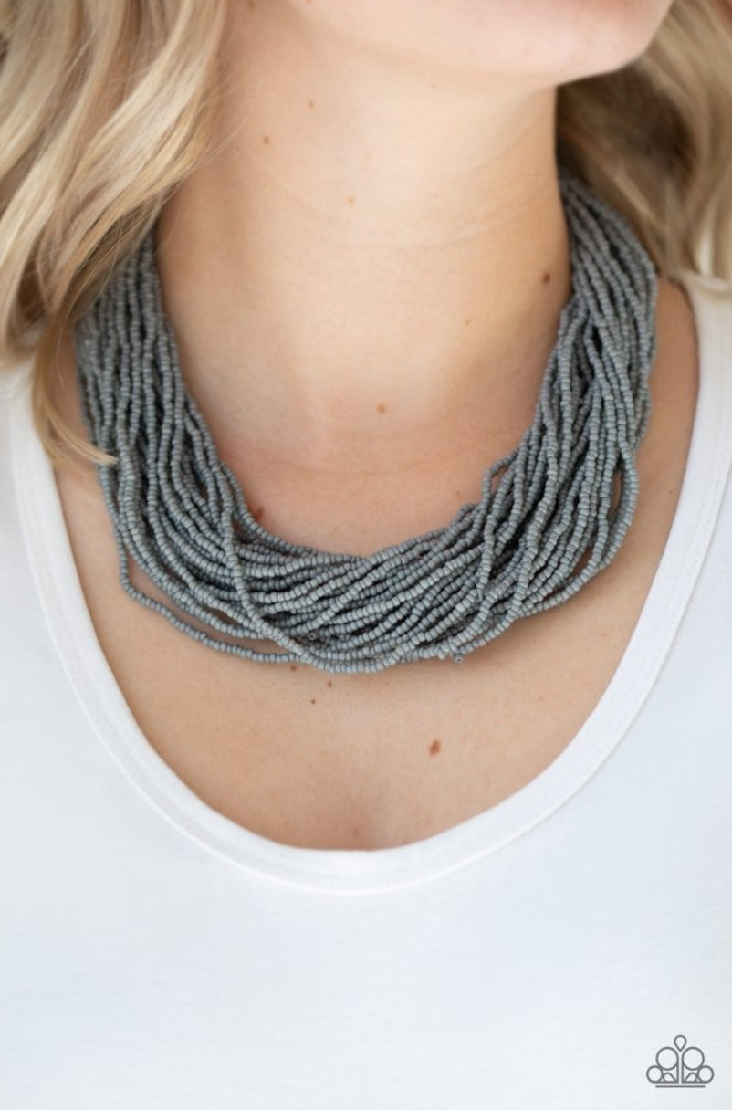 Infused with two bold silver fittings, countless strands of gray seed beads drape below the collar for a seasonal look. Features an adjustable clasp closure.
