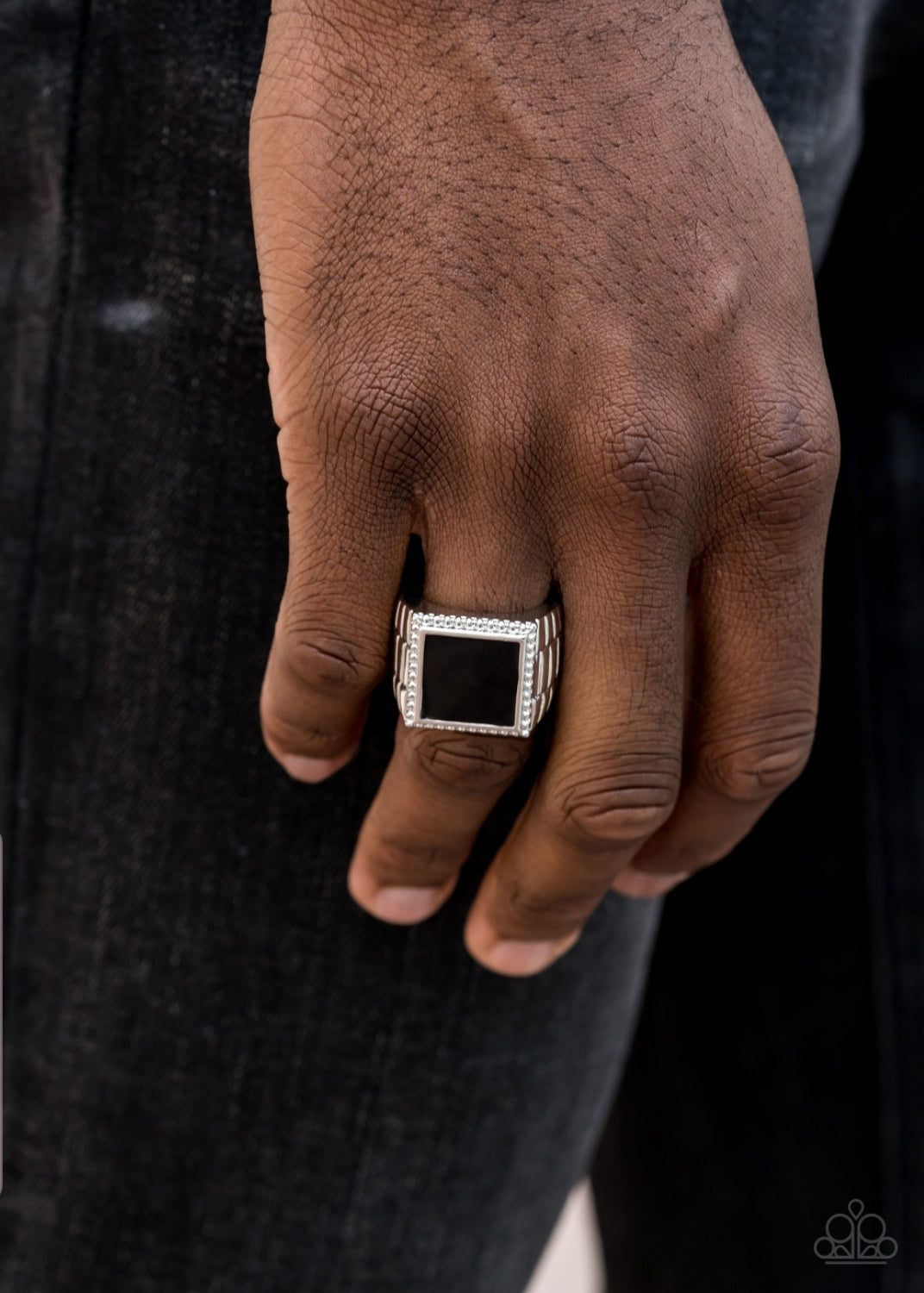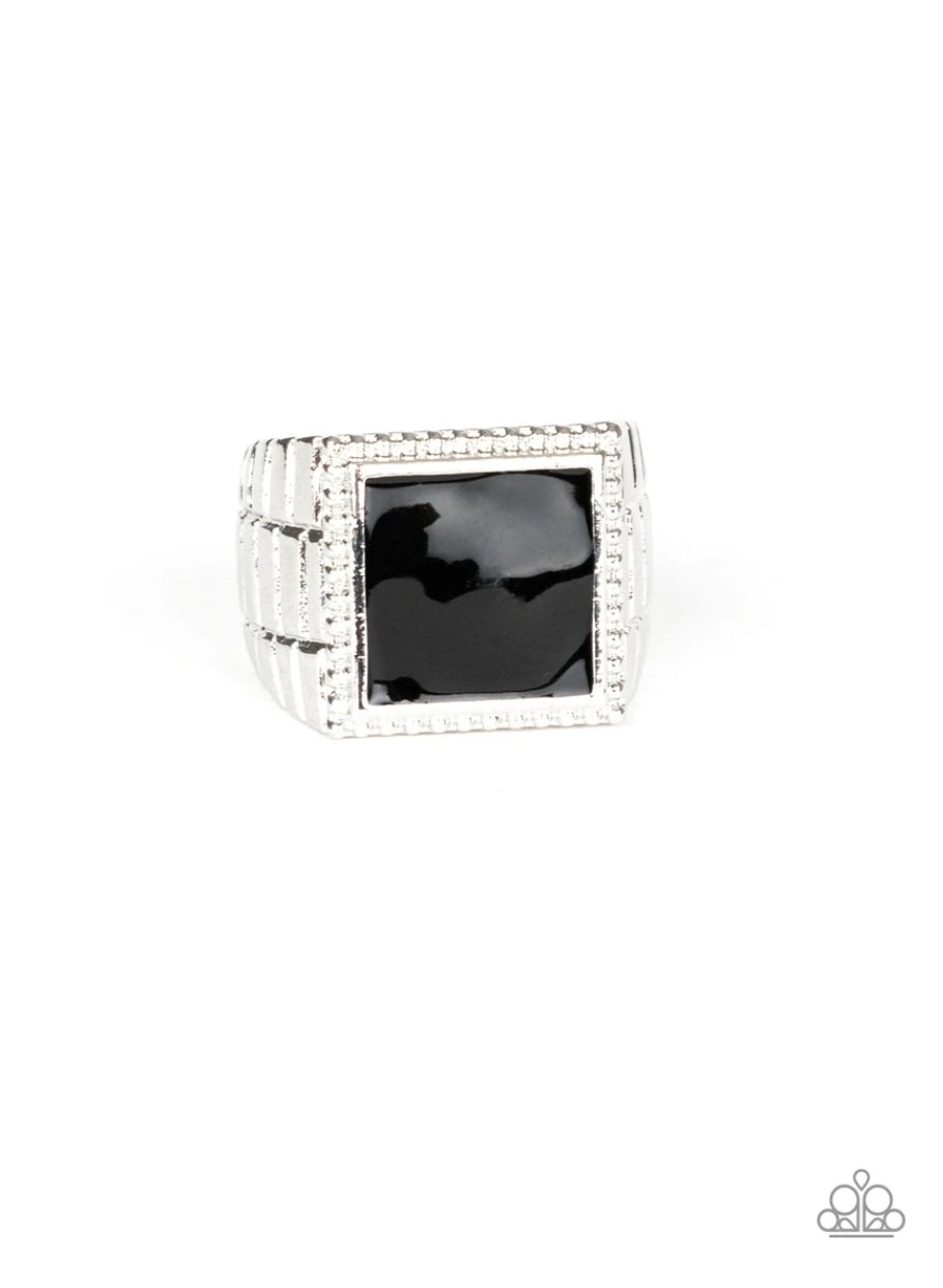 Painted in a shiny finish, a bold black square is bordered by silver studded detail atop a textured silver band for a sophisticated look. Features a stretchy band for a flexible fit.