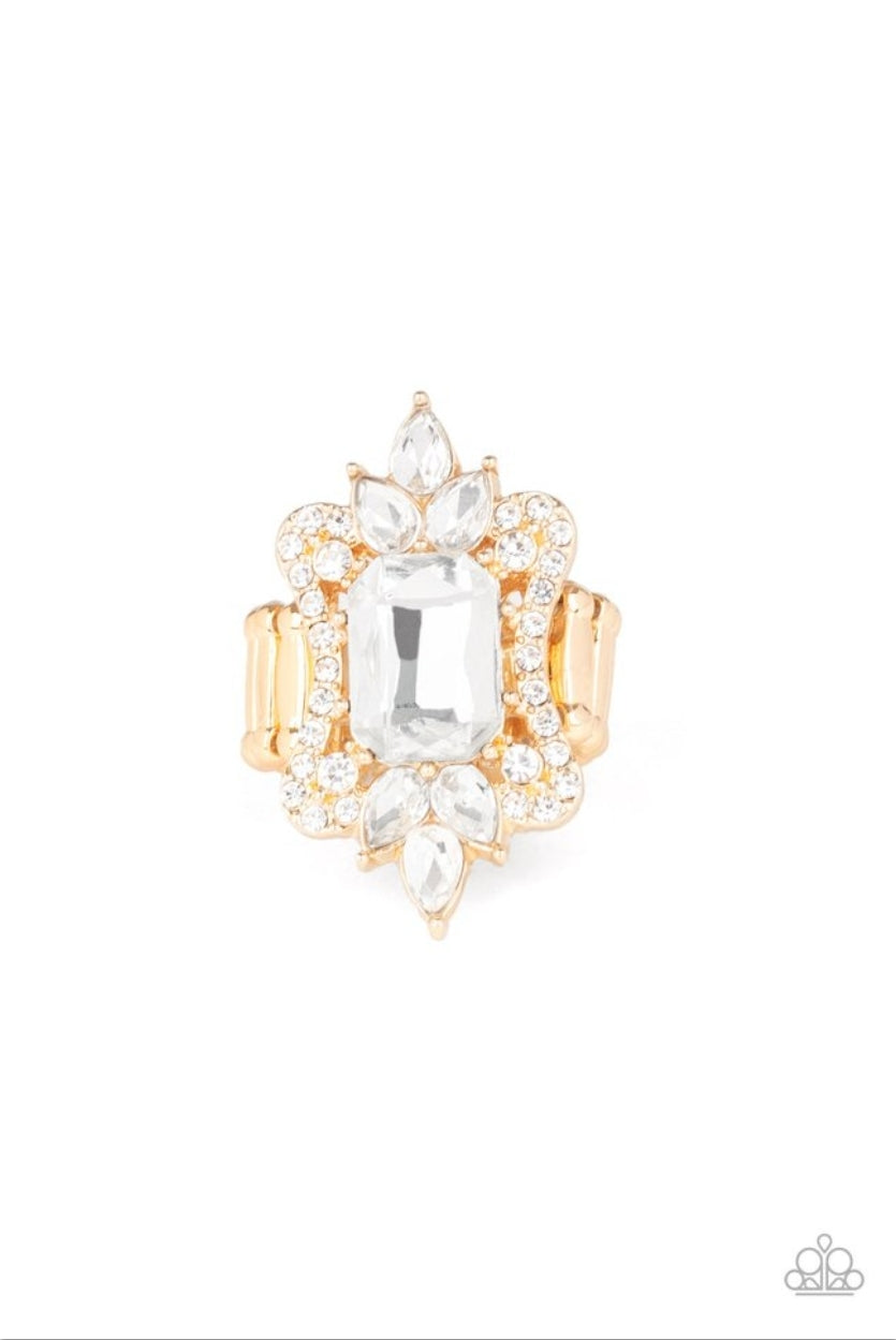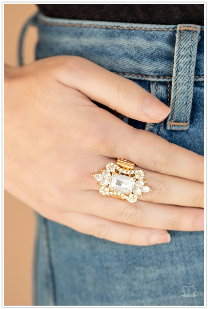 A blinding collection of round and teardrop white rhinestones coalesce around an oversized emerald-style gem, creating a dramatic statement piece atop the finger. Features a stretchy band for a flexible fit.