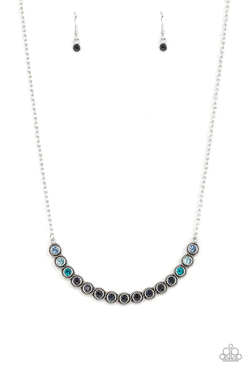 Encased in studded silver fittings, a glittery ombré of blue rhinestones delicately bows below the collar, creating an enchanting pop of color. Features an adjustable clasp closure.