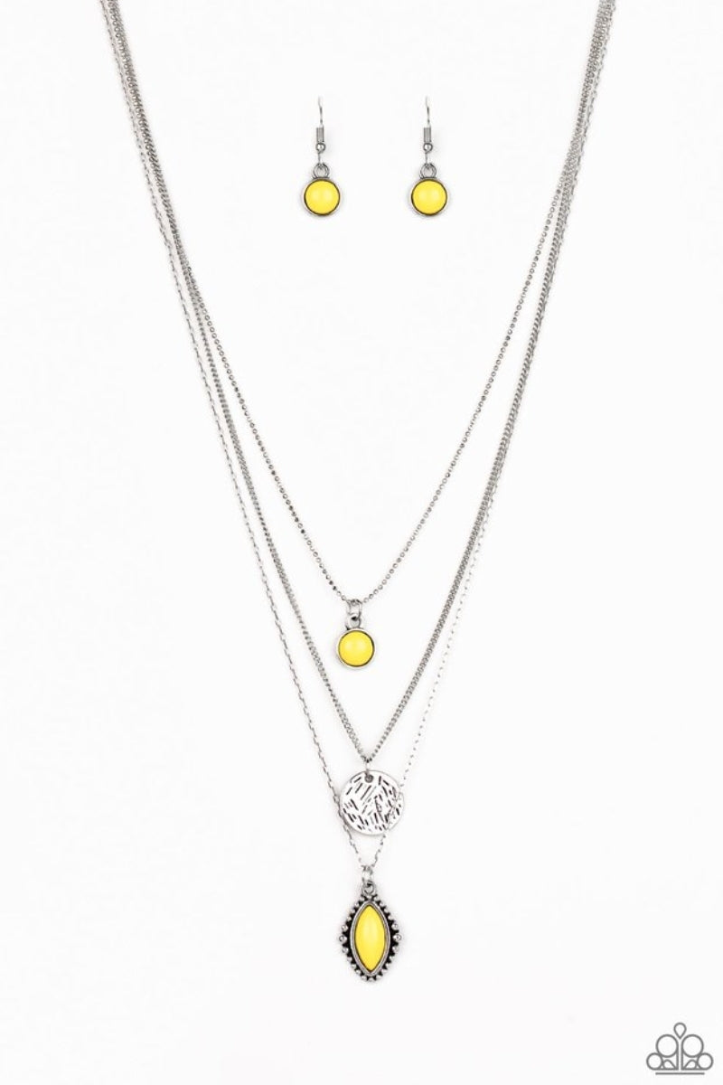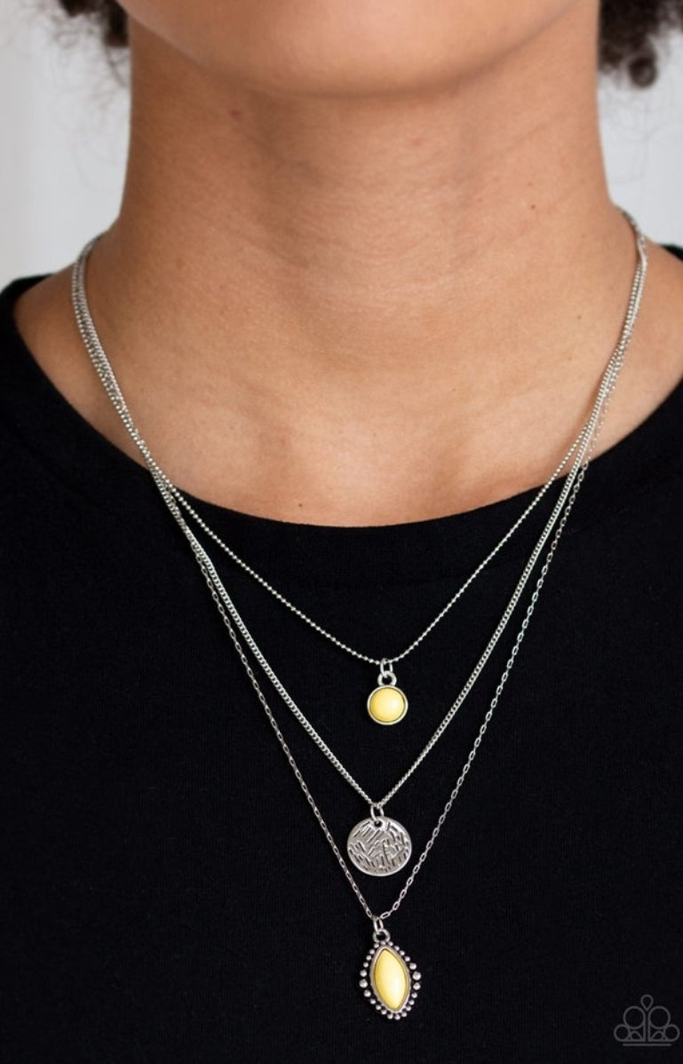 Three mismatched silver chains layer below the collar. A round yellow bead swings from the uppermost chain, above a scratched silver disc, and marquise-shaped yellow bead for a colorfully layered look. Features an adjustable clasp closure.