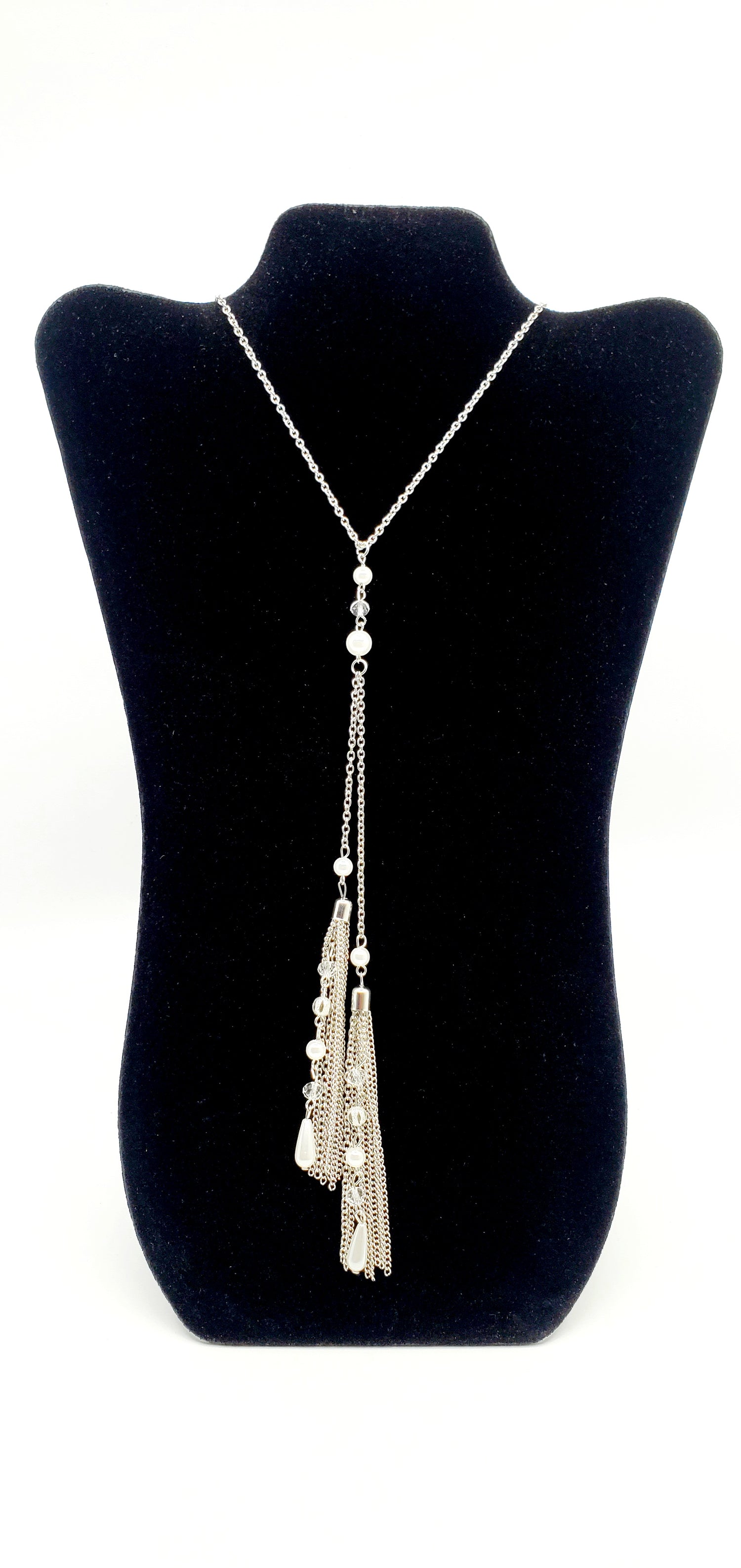 Dainty white pearls and sparkling white crystal-like beads gives way to two shimmery silver chain tassels. Infused with ornate silver beads, strands of matching beads trickle down the tassels for a refined flair. Features an adjustable clasp closure.