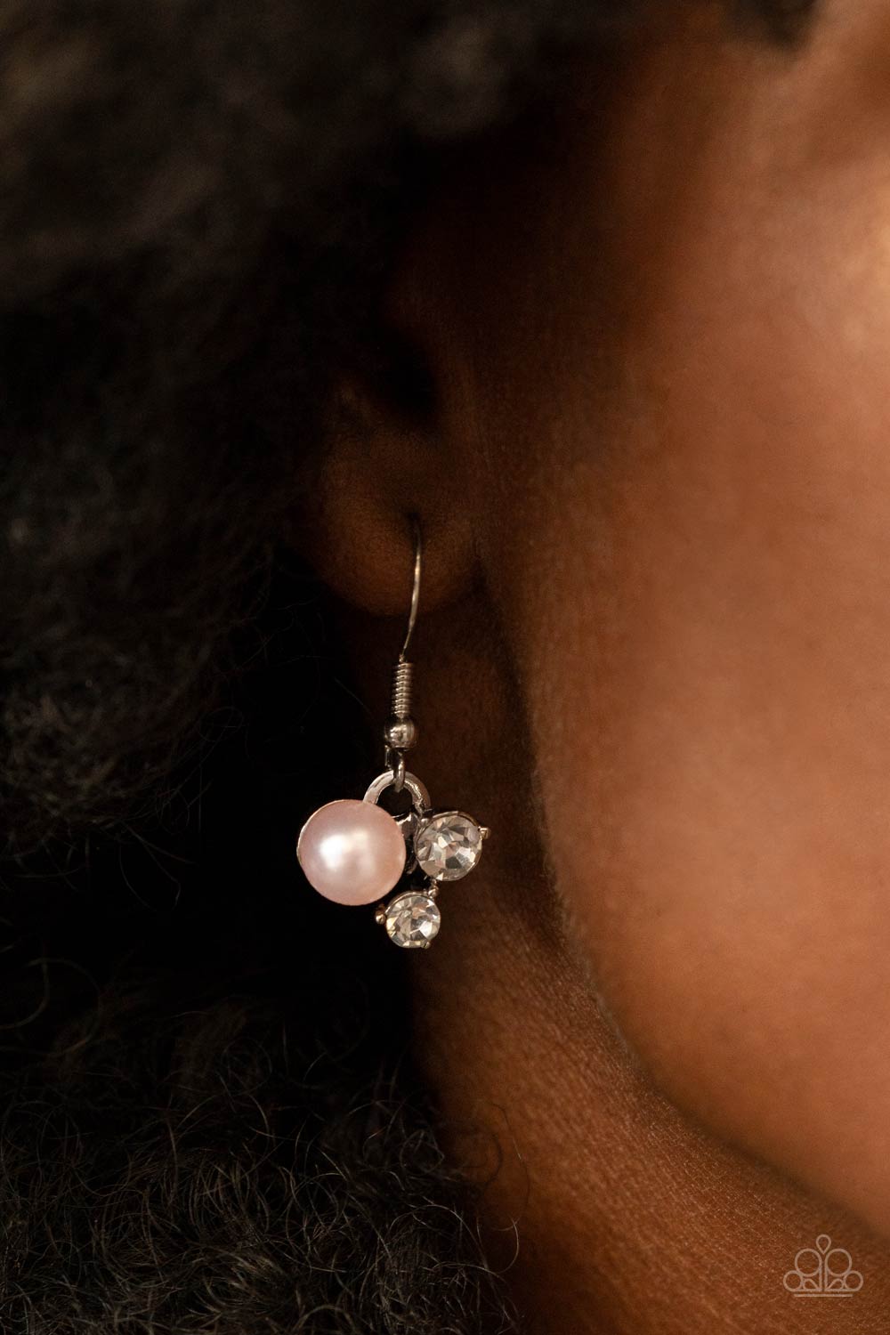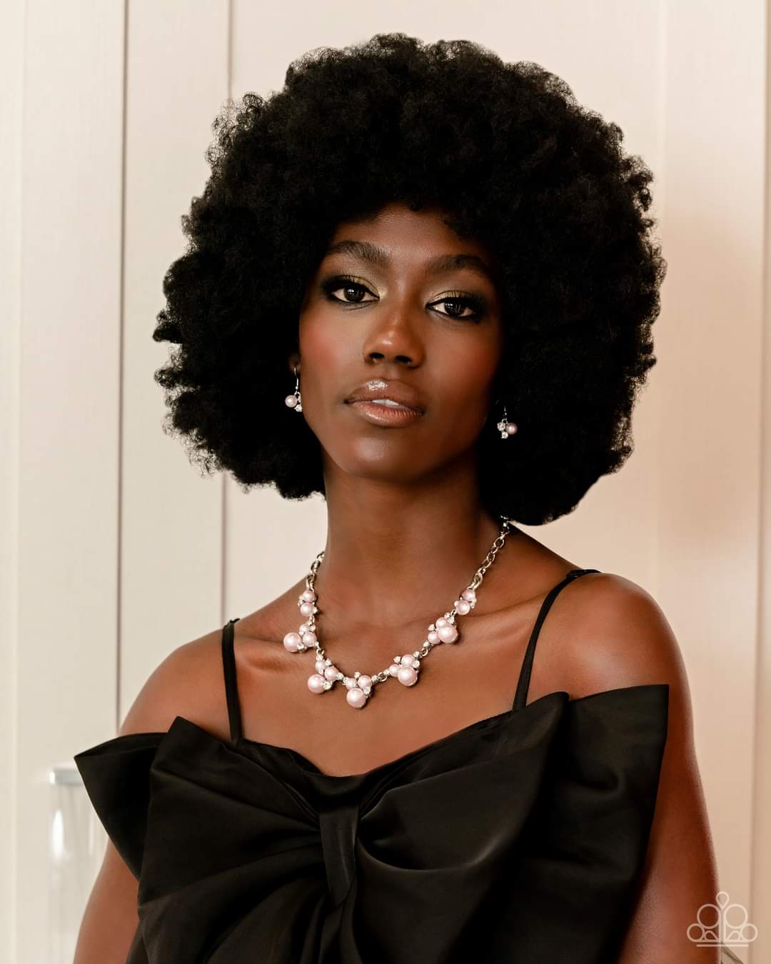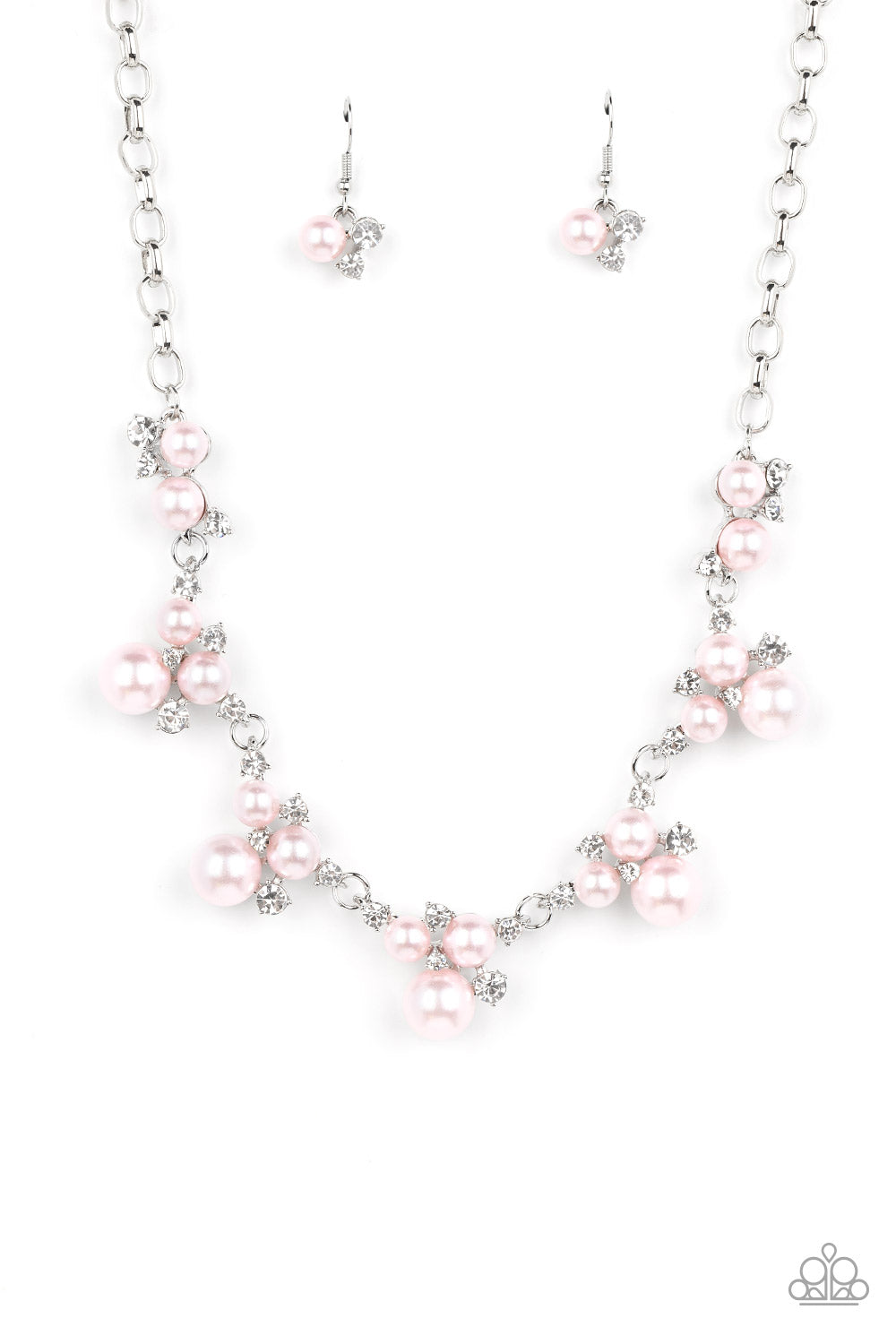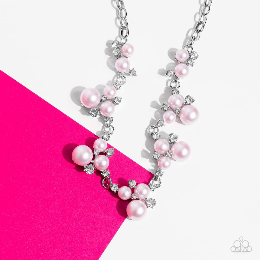 Clusters of pink pearls and dazzling white rhinestones join below the collar, creating refined frames. Infused with a glistening silver chain, the sections of luminescent frames trickle along the neck in a timeless fashion. Features an adjustable clasp closure.