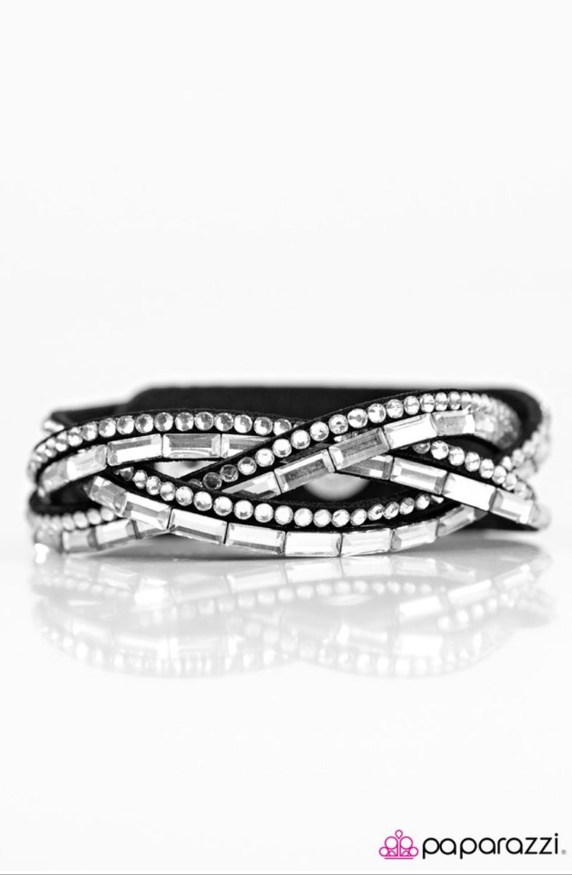A black strip of suede is spliced into glittery bands braided across the wrist in a sassy fashion. Classic round rhinestones and glassy emerald-cut beading create the ultimate collision of sparkle. Features an adjustable snap closure.