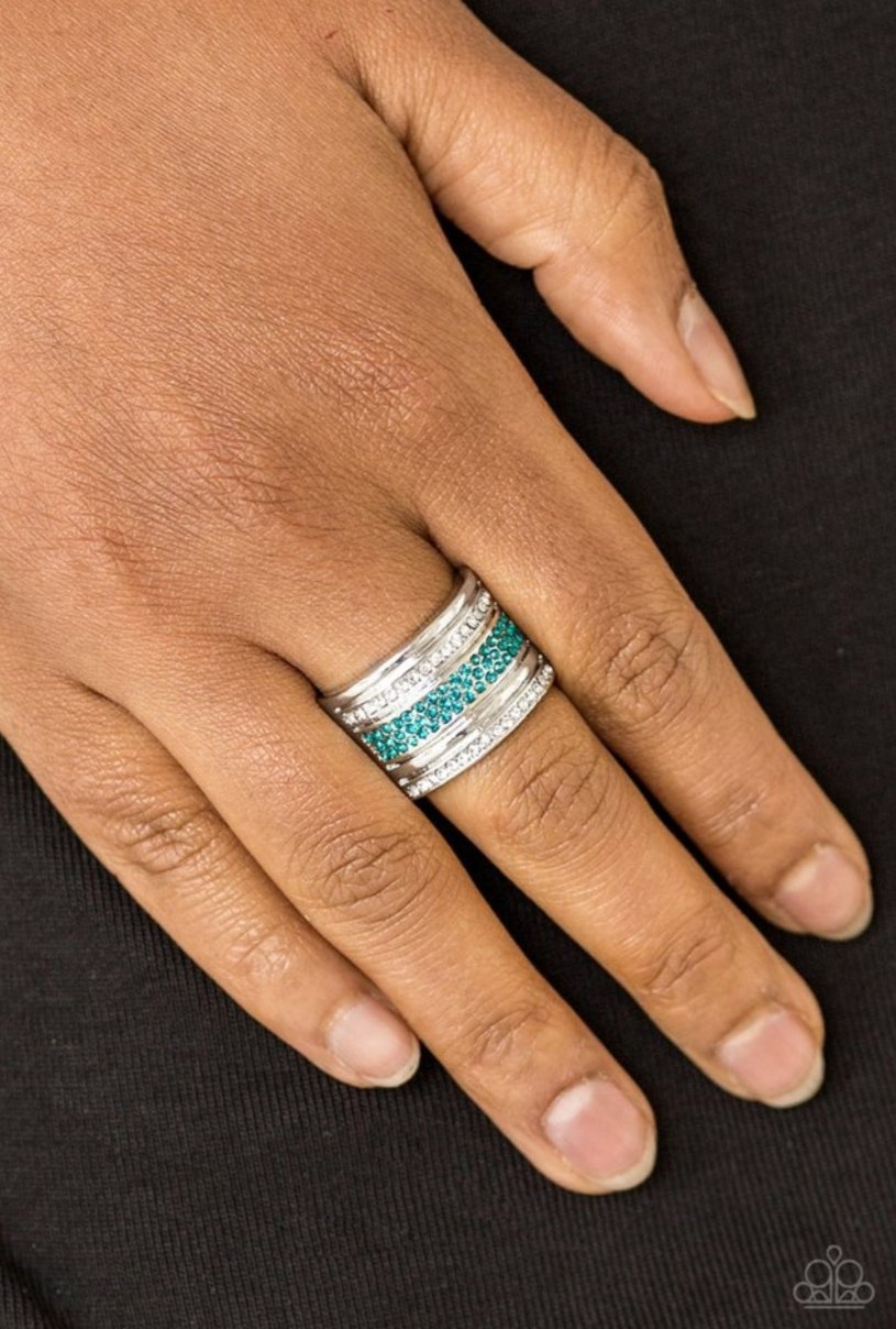 Blue and white rhinestone encrusted bands stack across the finger for a glamorous look. Features a stretchy band for a flexible fit.