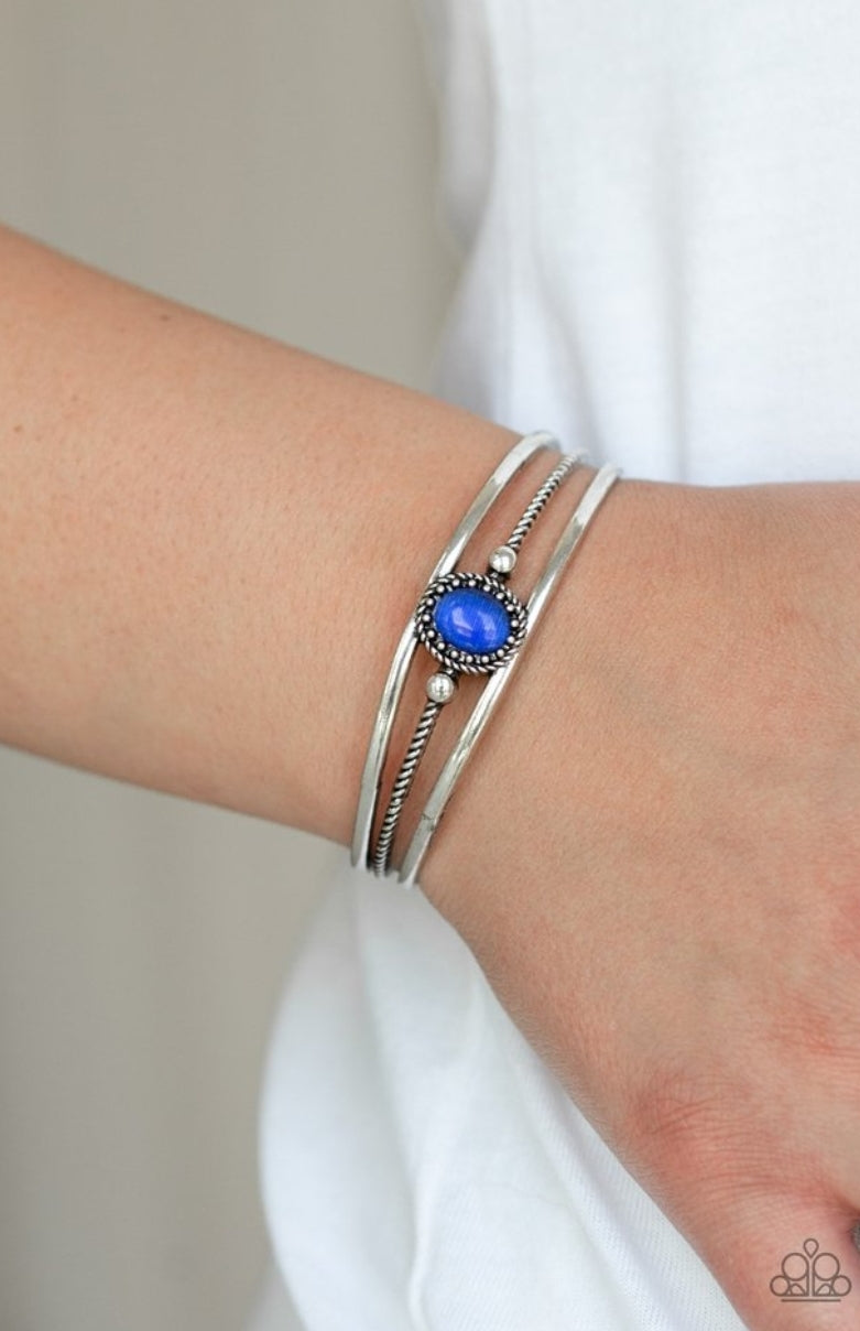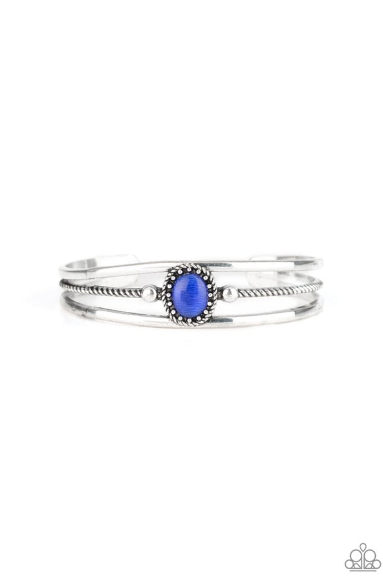 Smooth silver bars flank a textured silver band, coalescing into a layered cuff. A glowing blue cat's eye stone is pressed into the center of the cuff for a whimsical finish.