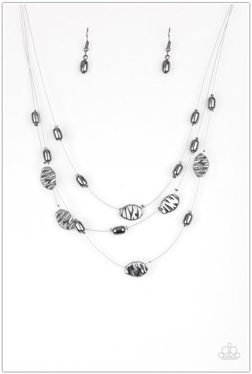 Featuring smooth and delicately hammered finishes, mismatched gunmetal beads are threaded along dainty silver wires, creating floating layers below the collar. Features an adjustable clasp closure.