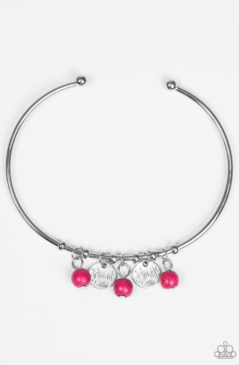 Infused with silver fittings, vivacious pink stones swing from a skinny silver bangle. Etched in serrated shimmer, a glistening silver disc swings from the wrist for a seasonal finish.
