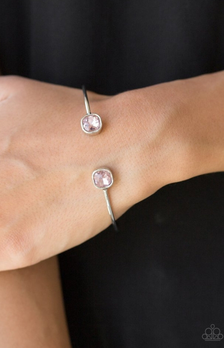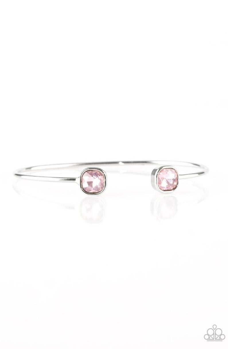 Attached to a curling silver bar, square pink rhinestones are pressed into silver fittings, creating a dainty cuff.