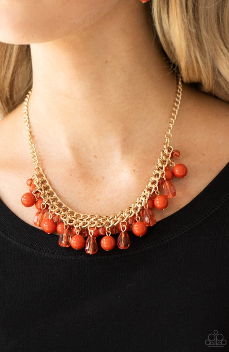 Varying in shape, glassy and polished orange beads swing from the bottom of interlocking gold chains. Crystal-like teardrops are sprinkled along the colorful beading, creating a flirtatious fringe below the collar. Features an adjustable clasp closure.