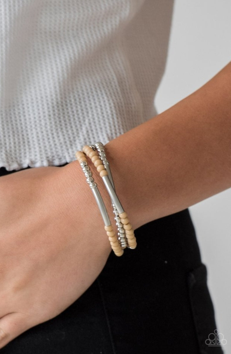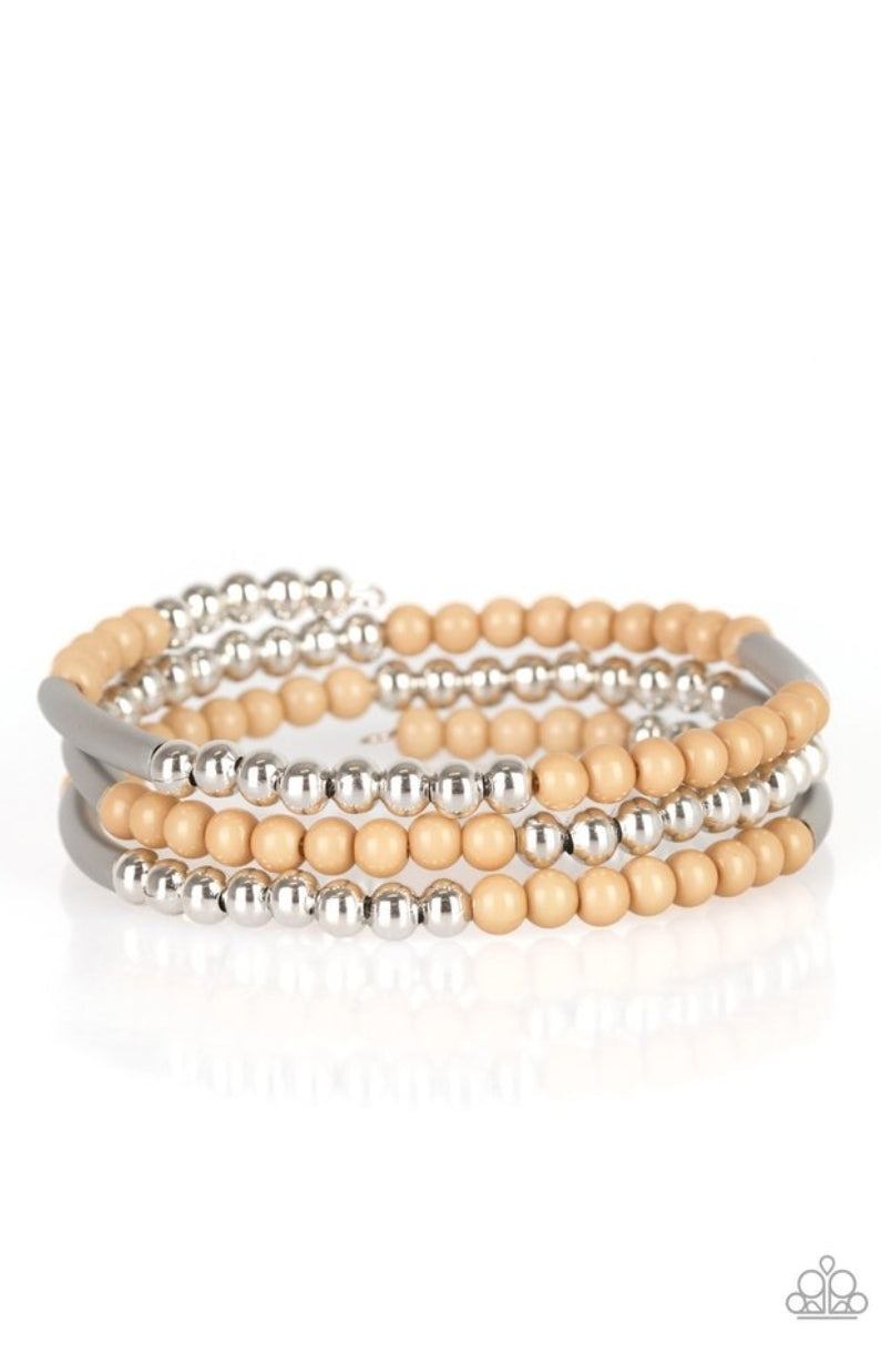A collection of neutral brown and shiny silver accents are threaded along a long wire to create an infinity wrap bracelet. Coil design allows for an adjustable fit.