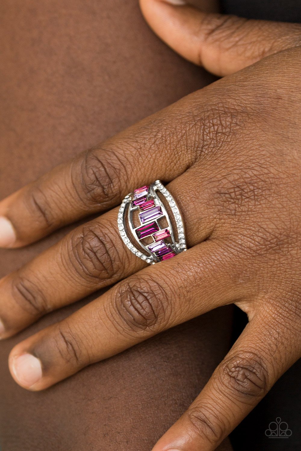 White rhinestone encrusted bands flank a row of emerald cut glass beads in shades of purple for a regal look. Features a stretchy band for a flexible fit.
