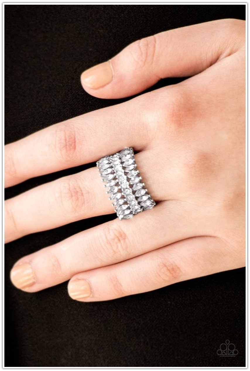 Featuring refined marquise cuts, glittery white rhinestones flare from a center of glassy white rhinestones, creating a regal band across the finger. Features a stretchy band for a flexible fit.