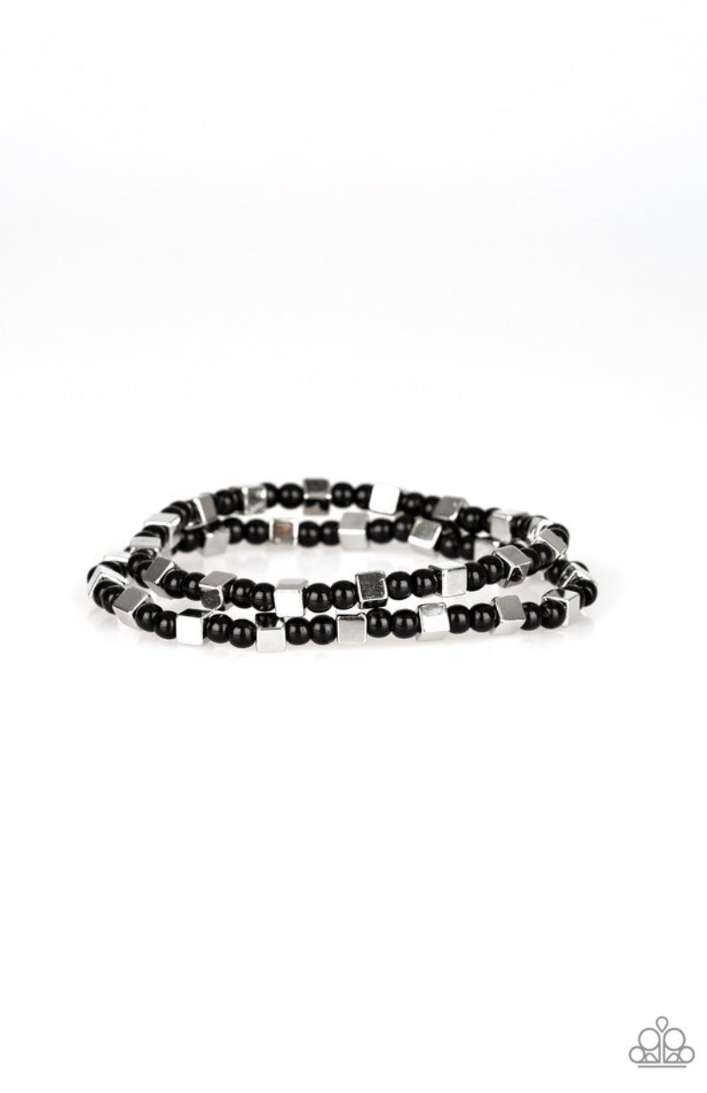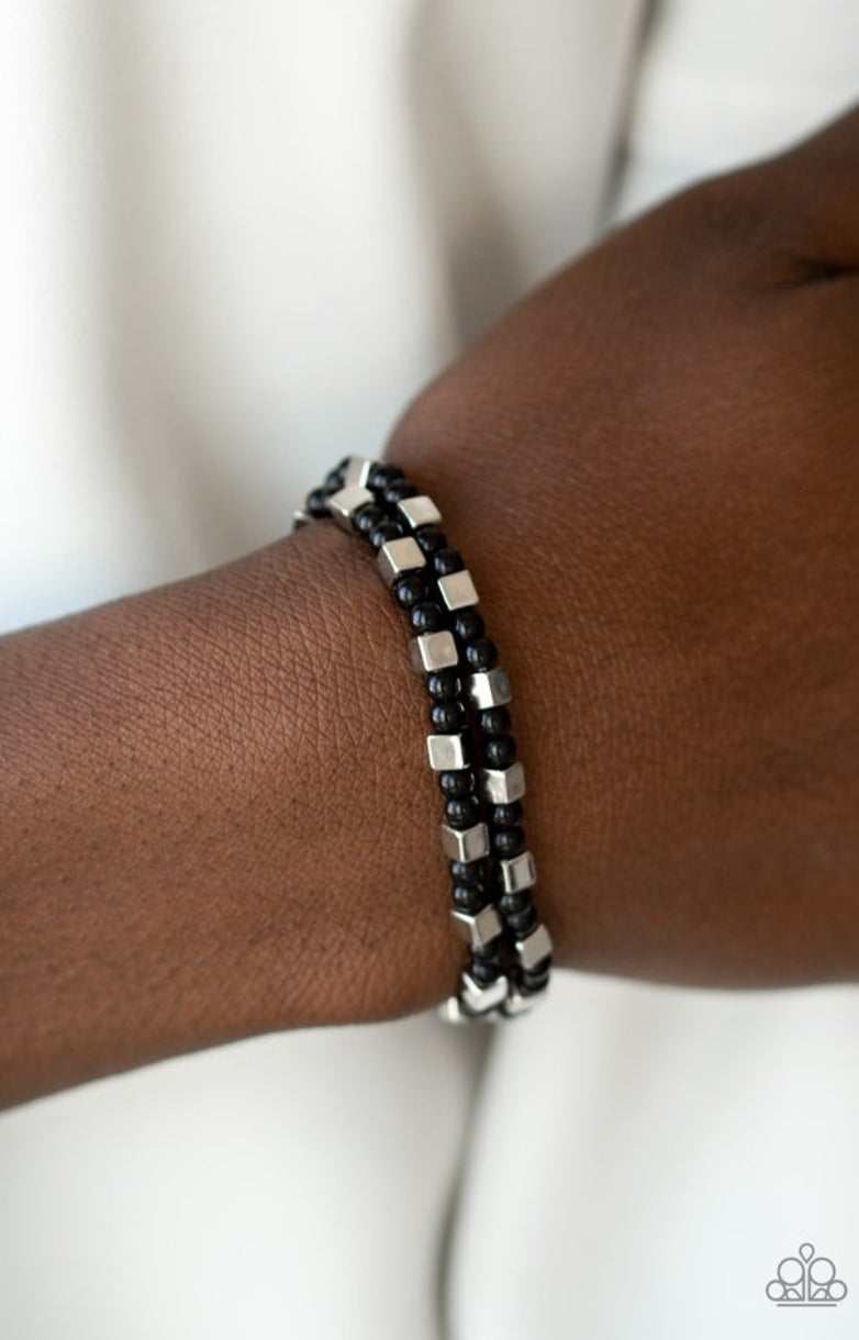 A collection of dainty black beads and silver cube beads are threaded along stretchy bands around the wrist, creating colorful layers.