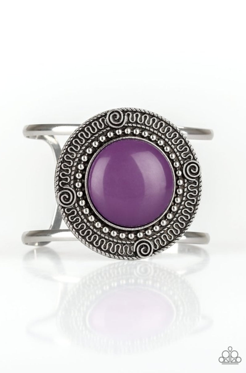 An oversized purple bead is pressed into the center of a round silver frame radiating with swirly filigree detail. The bold frame sits atop an airy silver cuff for a vibrant pop of color.
