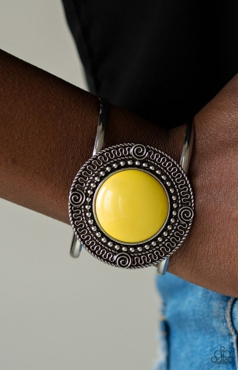 An oversized yellow bead is pressed into the center of a round silver frame radiating with swirly filigree detail. The bold frame sits atop an airy silver cuff for a vibrant pop of color.