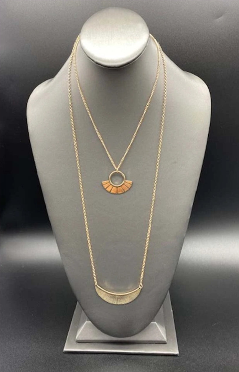 Radiating with linear patterns, a flared gold frame swings above a gold half-moon frame, creating tribal inspired layers below the collar. Features an adjustable clasp closure.